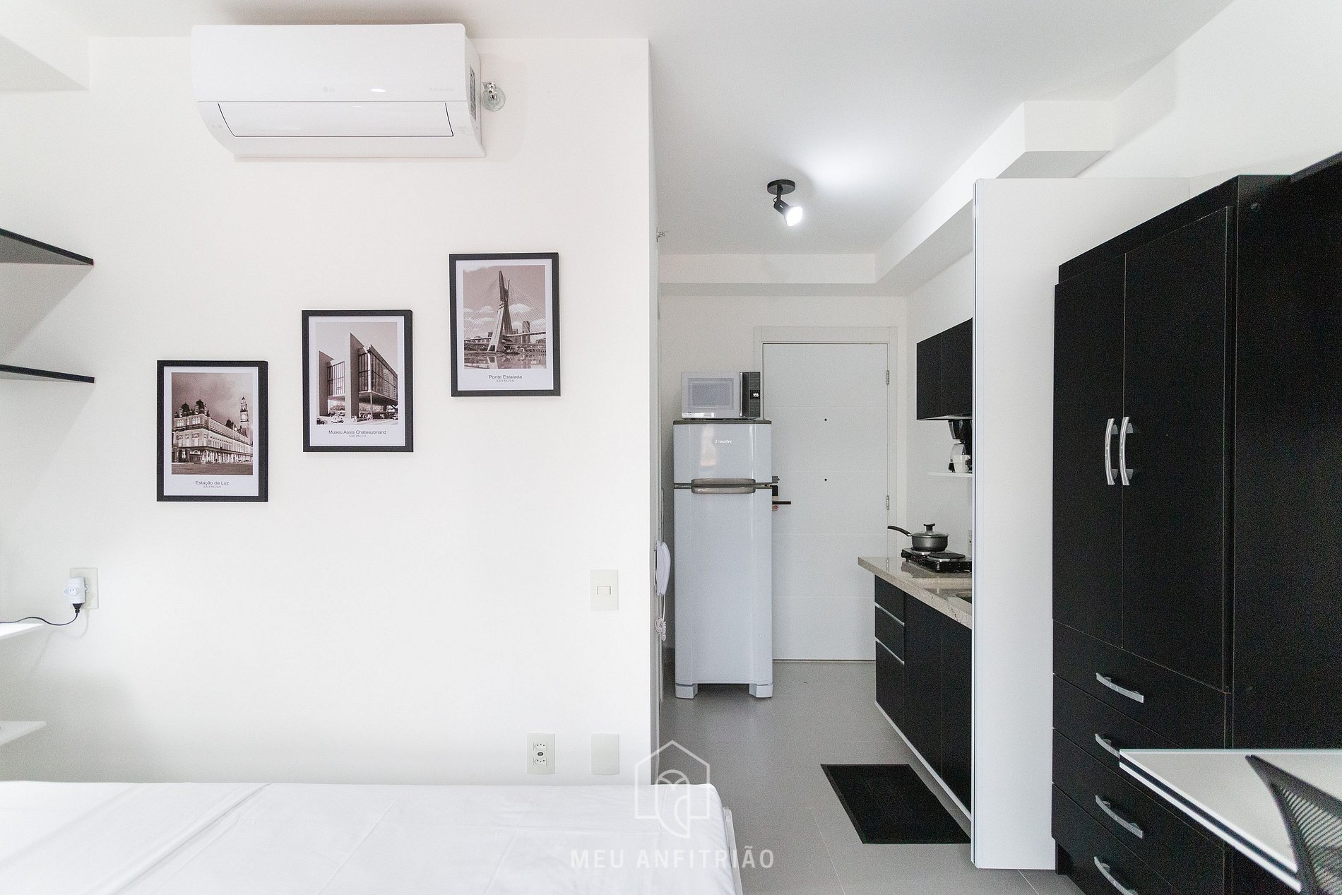 Entrando no studio, o hóspede poderá acessar a cozinha, que conta com os utensílios ideais para a estadia, como geladeira, fogão cooktop, micro-ondas, sanduicheira, cafeteira elétrica, filtro d’água entre outros.