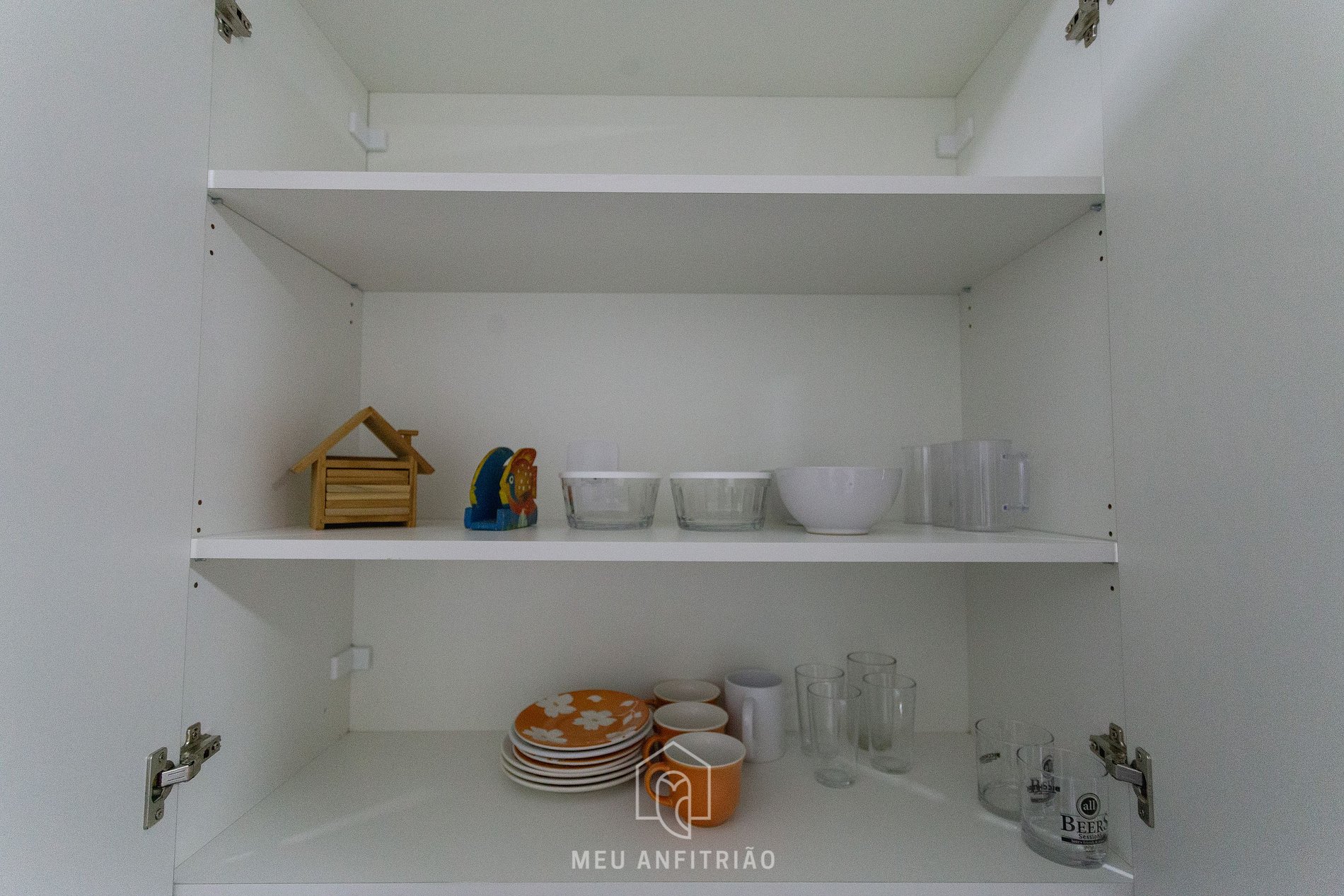Ao entrar, o hóspede terá acesso à cozinha, que conta com os utensílios necessários para uma estadia prática como fogão cooktop, geladeira, micro-ondas, cafeteira Três Corações, sanduicheira, mixer, chaleira elétrica entre outros. A varanda conta com porta de vidro e cortinas blackout, além de mesa com cadeiras para refeições e vista para a cidade.