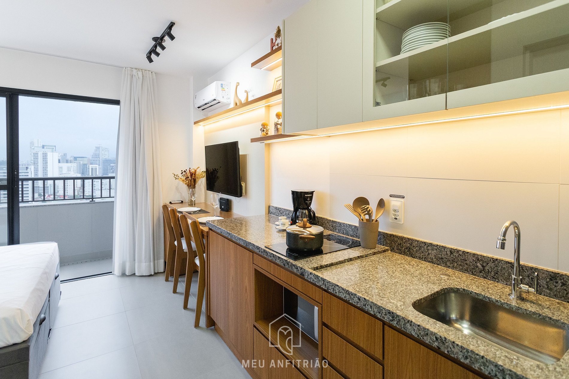 Ao entrar no studio, o hóspede tem acesso à cozinha equipada com os principais utensílios para uma estadia funcional, incluindo geladeira, cooktop, micro-ondas, cafeteira elétrica, liquidificador, sanduicheira, entre outros itens. A varanda possui porta de vidro, cortinas blackout e vista para a cidade.