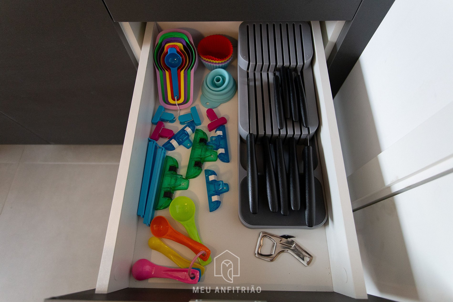 Ao entrar, o hóspede terá acesso à cozinha, que conta com os utensílios necessários para uma estadia prática como fogão cooktop, geladeira, micro-ondas, filtro d’água, liquidificador, air fryer, sanduicheira, cafeteira elétrica entre outros, além de uma mesa com cadeiras para refeições