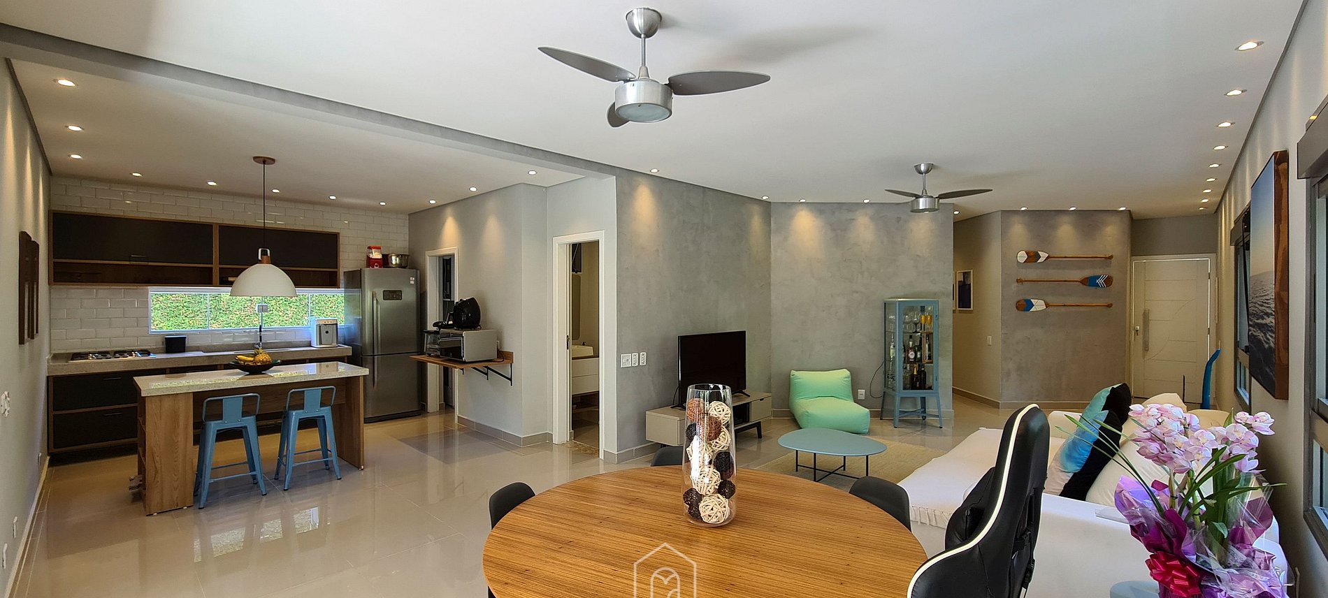Logo ao entrar na casa, o hóspede terá acesso à uma sala de estar com TV a cabo, sofá retrátil e mesa de jantar. A cozinha é completa com utensílios necessários para a estadia, além de ter uma ilha central com duas banquetas. Nesse espaço contamos, ainda, com um lavabo.