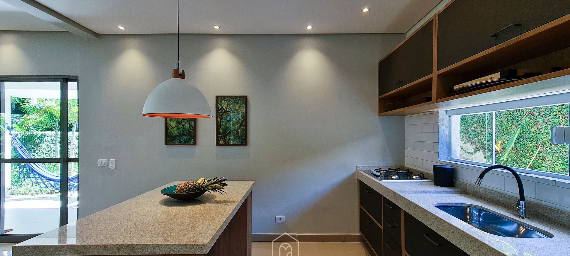 Logo ao entrar na casa, o hóspede terá acesso à uma sala de estar com TV a cabo, sofá retrátil e mesa de jantar. A cozinha é completa com utensílios necessários para a estadia, além de ter uma ilha central com duas banquetas. Nesse espaço contamos, ainda, com um lavabo.