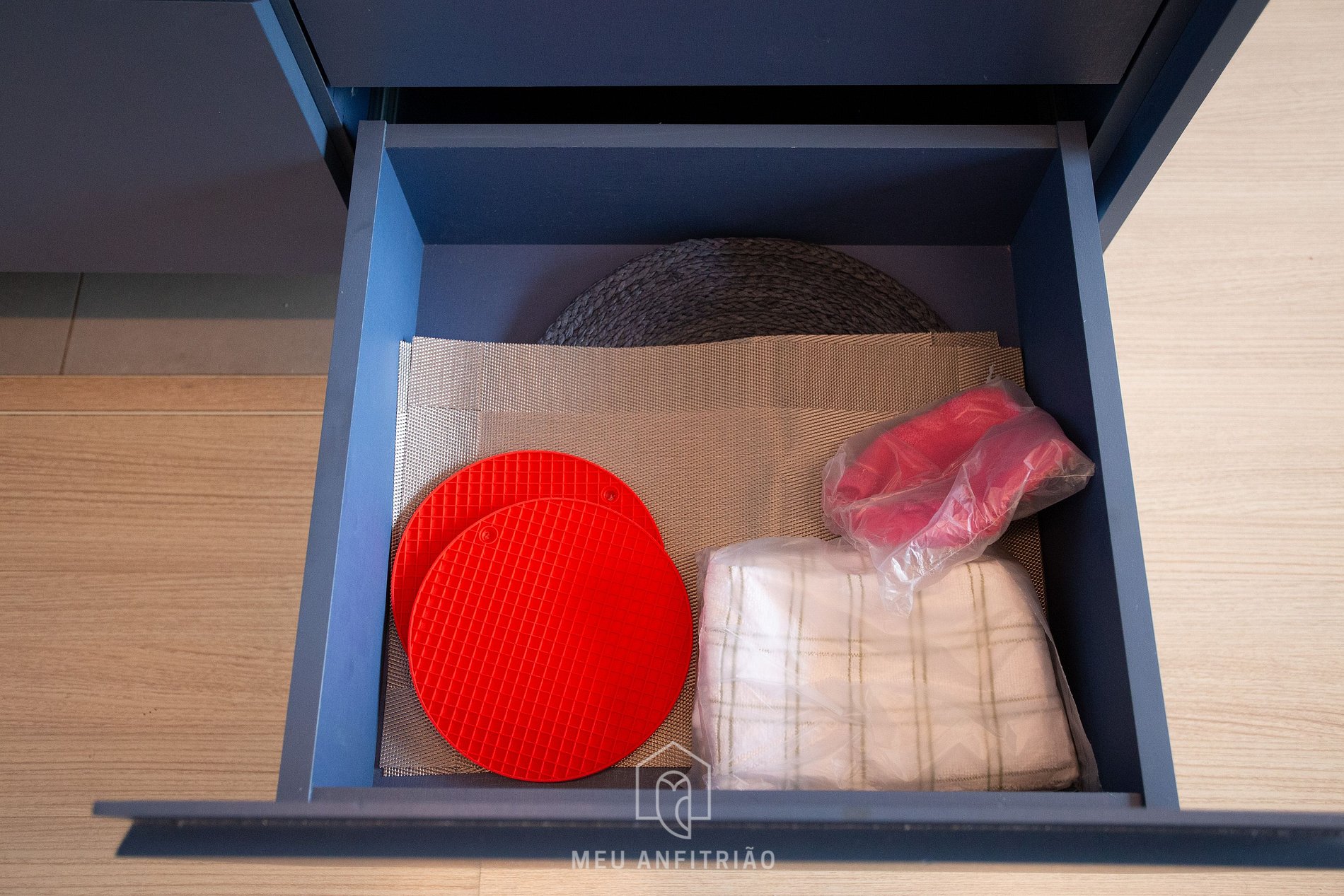 Ao entrar, o hóspede estará na cozinha, que conta com os utensílios essenciais para uma estadia prática, como geladeira, fogão cooktop, micro-ondas, cafeteira elétrica, liquidificador entre outros.
