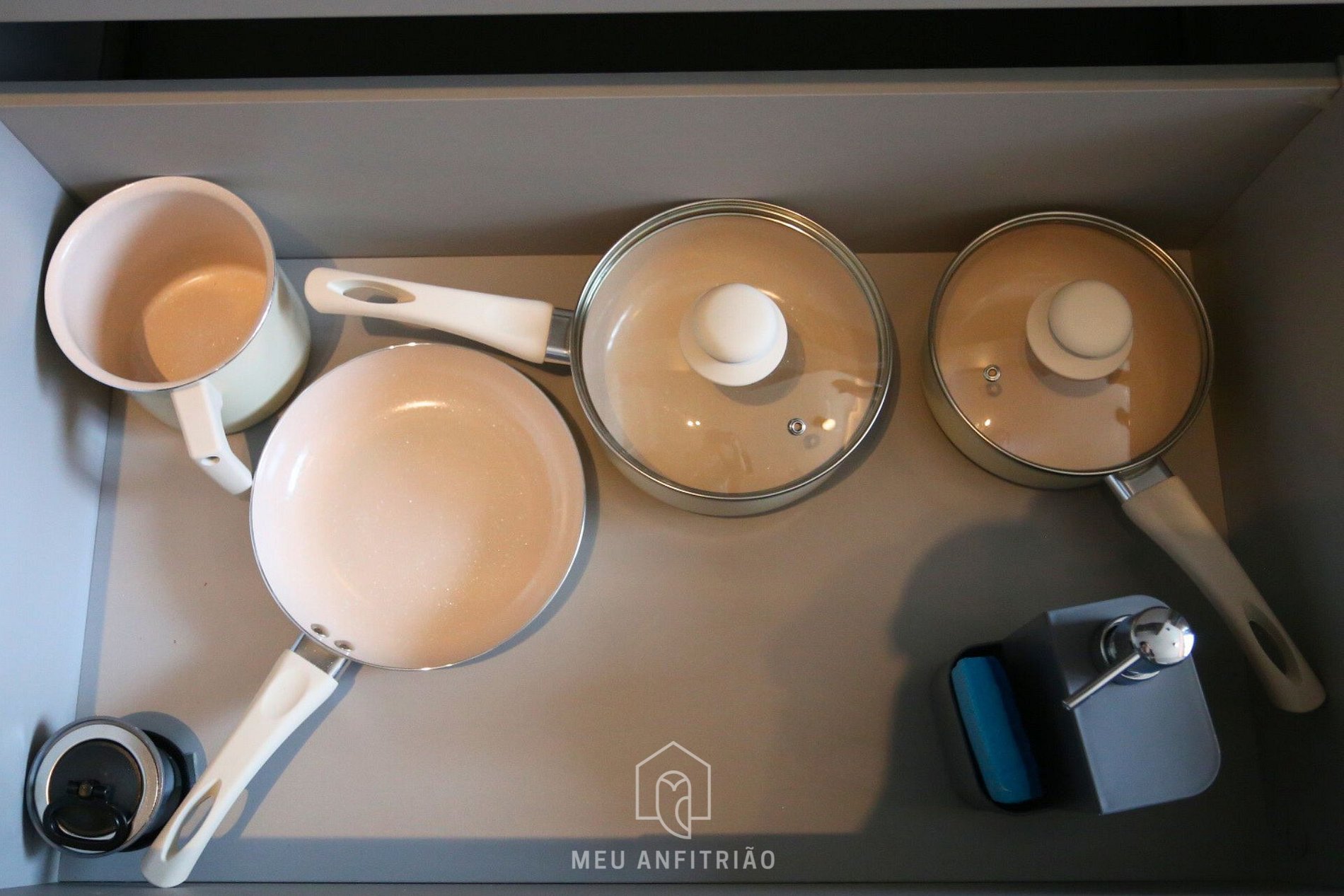 Assim que entrar, o hóspede terá acesso à cozinha, que conta com os utensílios ideais para uma estadia prática, como frigobar, fogão cooktop, micro-ondas, sanduicheira, liquidificador, cafeteira e chaleira elétrica entre outros.