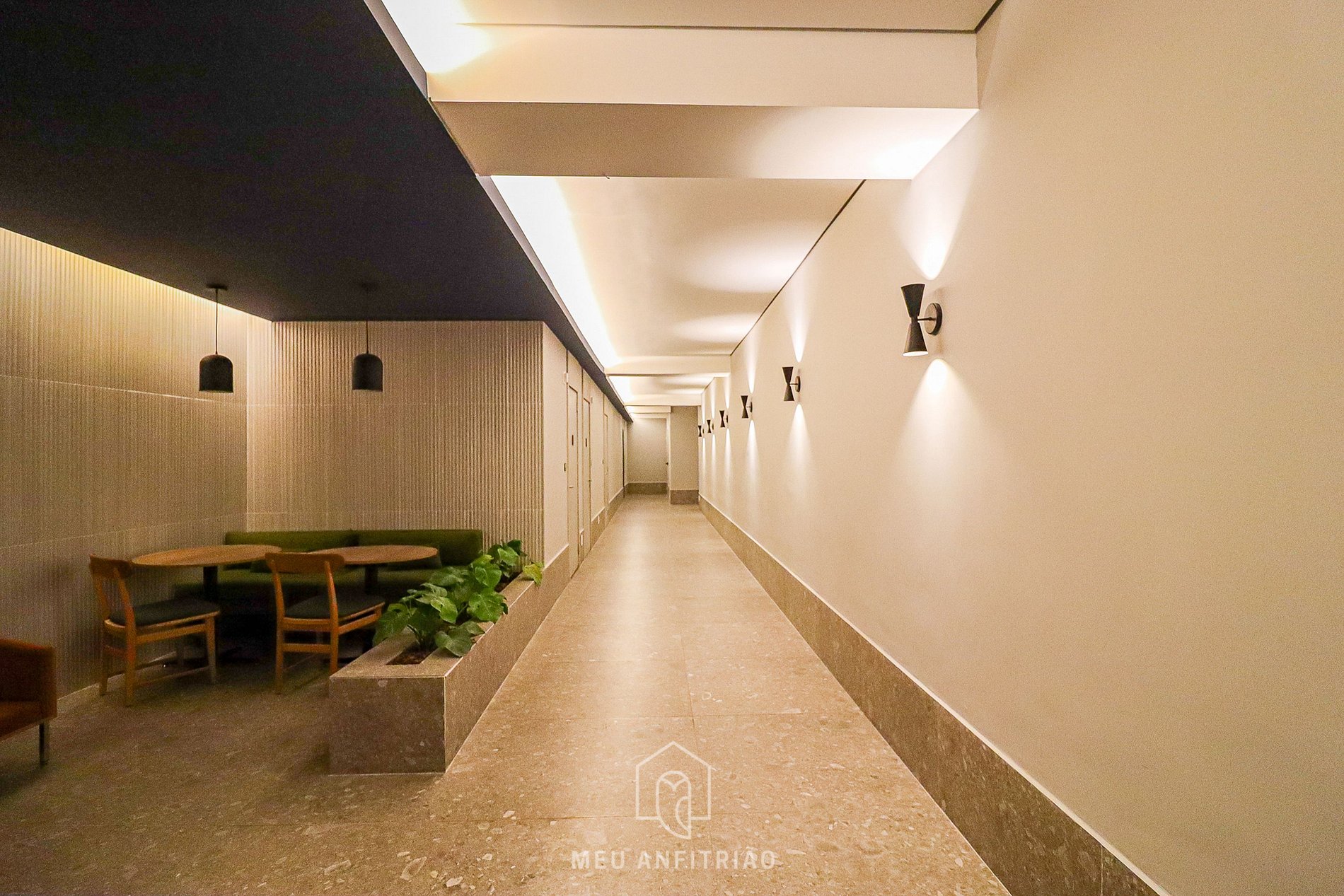 Ao entrar, o hóspede estará na cozinha, que conta com água aquecida na torneira da pia e com os utensílios necessários para uma estadia prática, como fogão cooktop, geladeira, micro-ondas, purificador de água Electrolux com água gelada e natural, coifa, forno elétrico, mixer, cafeteira Nespresso, sanduicheira entre outros. A varanda conta com vista para a cidade, cortinas blackout e fechamento de vidro, além de uma mesa com cadeira para home office.