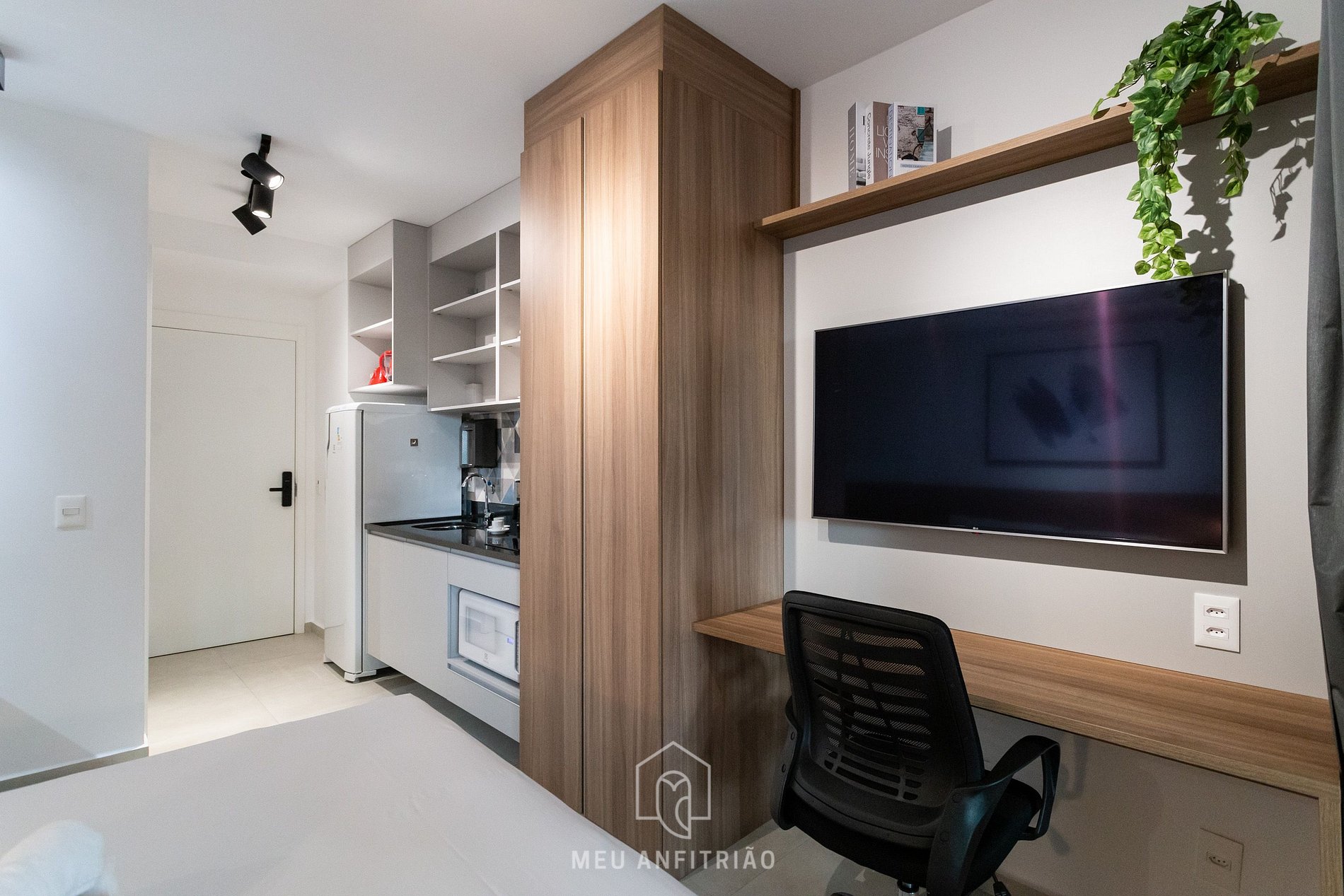 No mesmo ambiente dispomos de uma cozinha com utensílios necessários para uma estadia prática, armário, escrivaninha para home office, TV Smart e cortina blackout. Uma varanda com porta de vidro separa os espaços. No local, há uma mesa com cadeiras para fazer refeições.