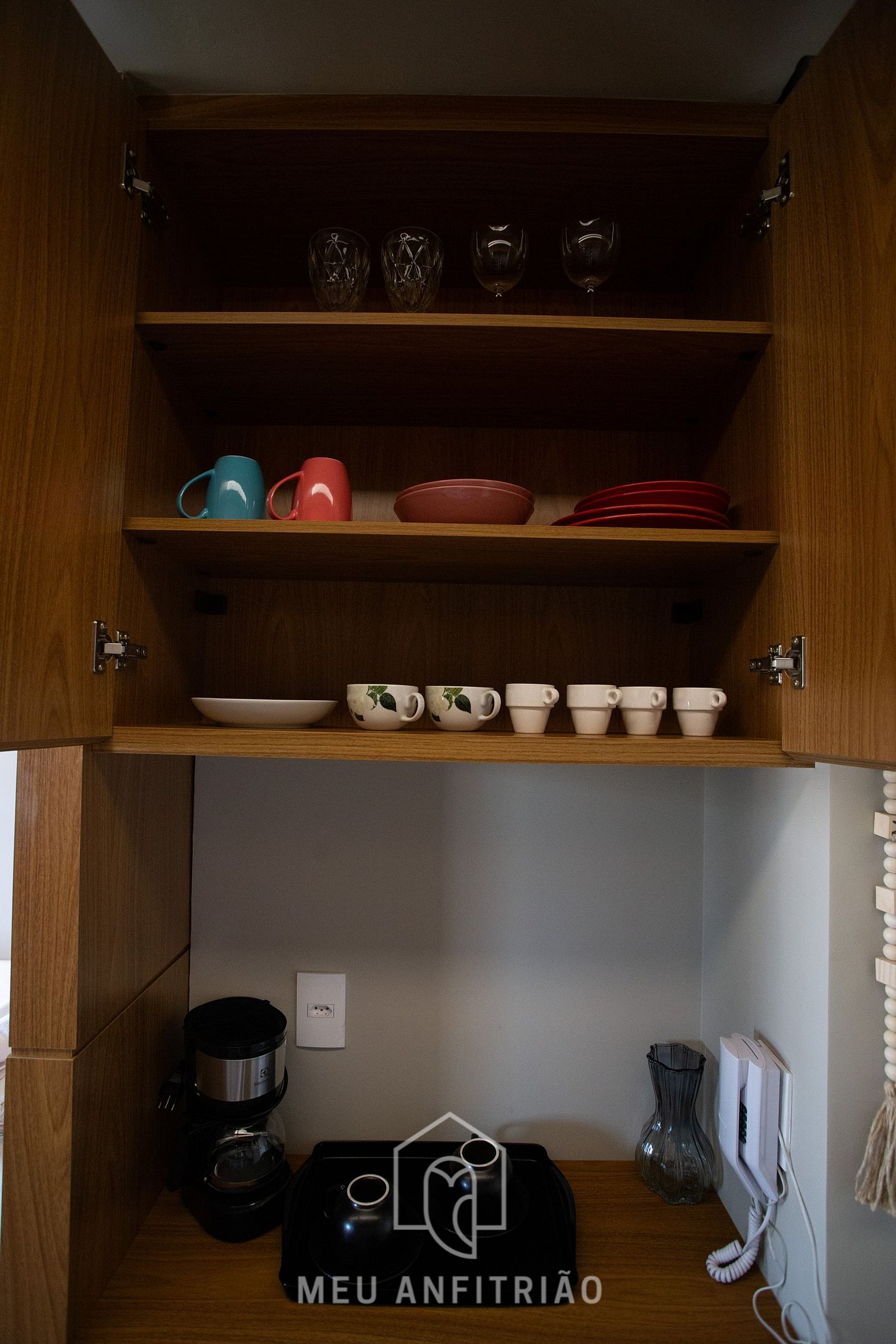 O hóspede estará na cozinha ao entrar no studio, que conta com os utensílios ideais para uma estadia prática, como frigobar, fogão cooktop, micro-ondas, forno elétrico, sanduicheira, liquidificador, cafeteira e chaleira elétrica entre outros.