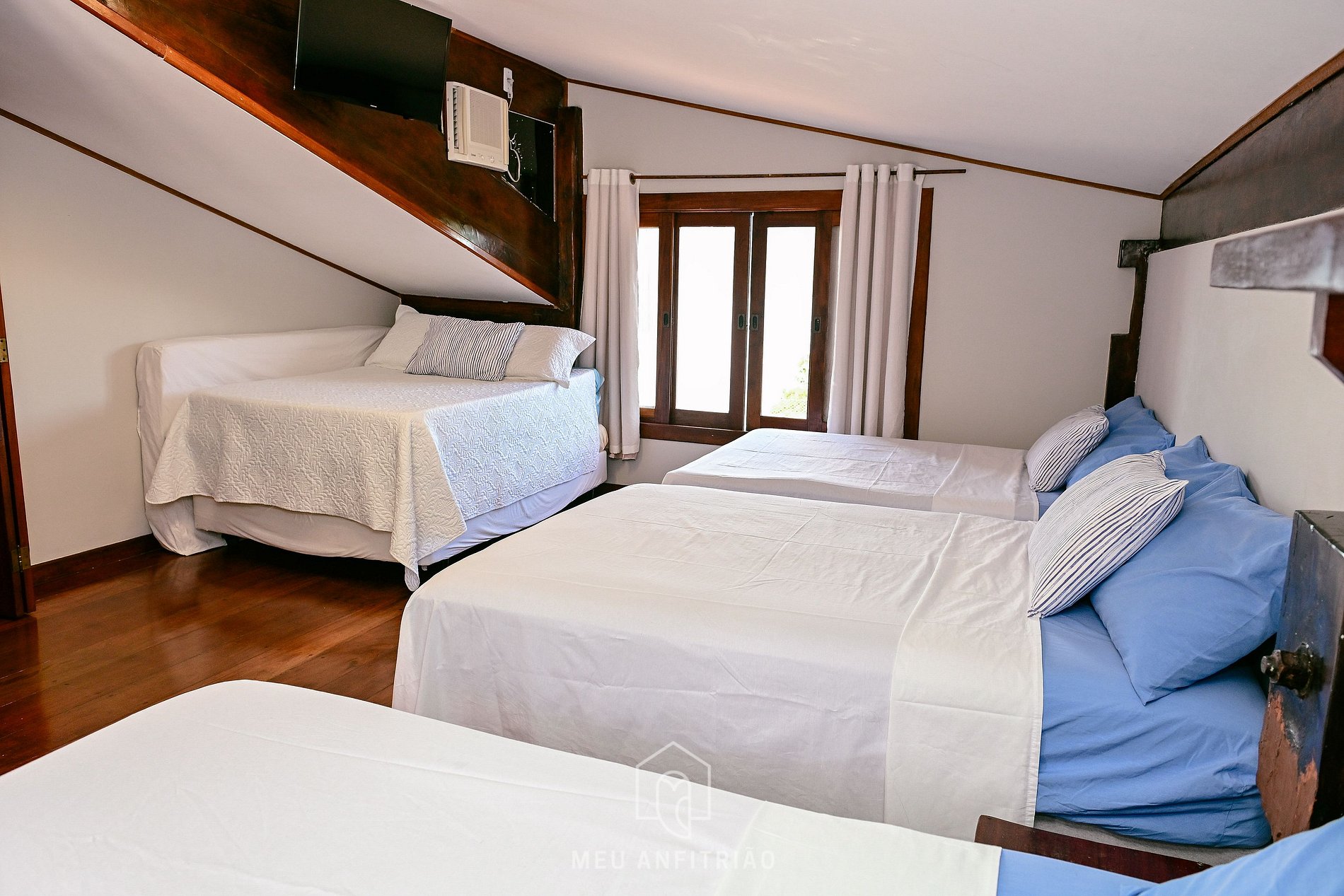 As duas suítes do andar térreo contam com uma cama queen e uma cama de solteiro em cada, além de guarda-roupas e escrivaninha.