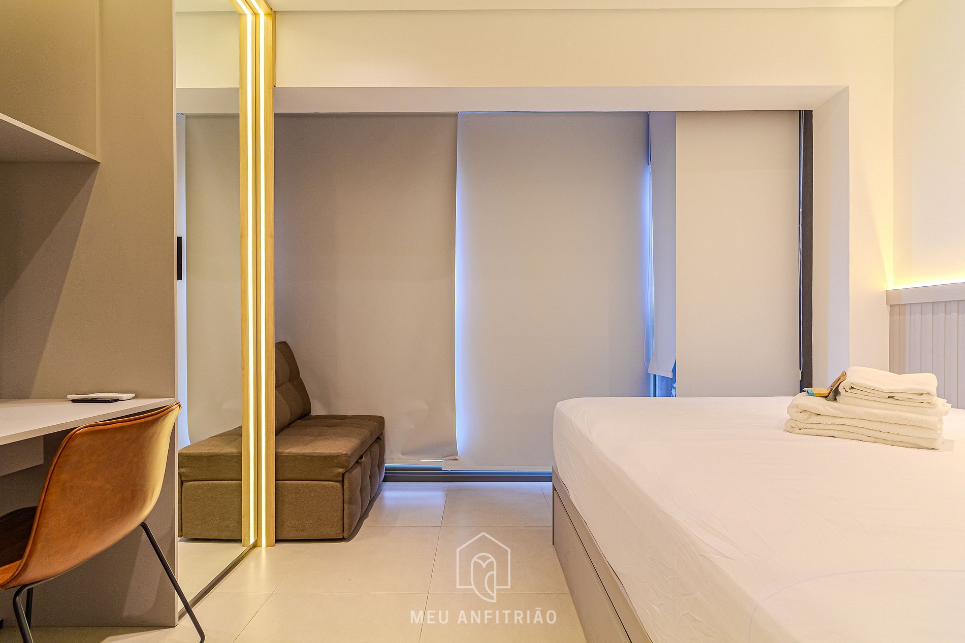 Nosso studio acomoda até 2 pessoas em uma cama de casal e conta com um espaço de aproximadamente 23m². O condomínio dispõe de portaria presencial 24h e área de lazer completa.
