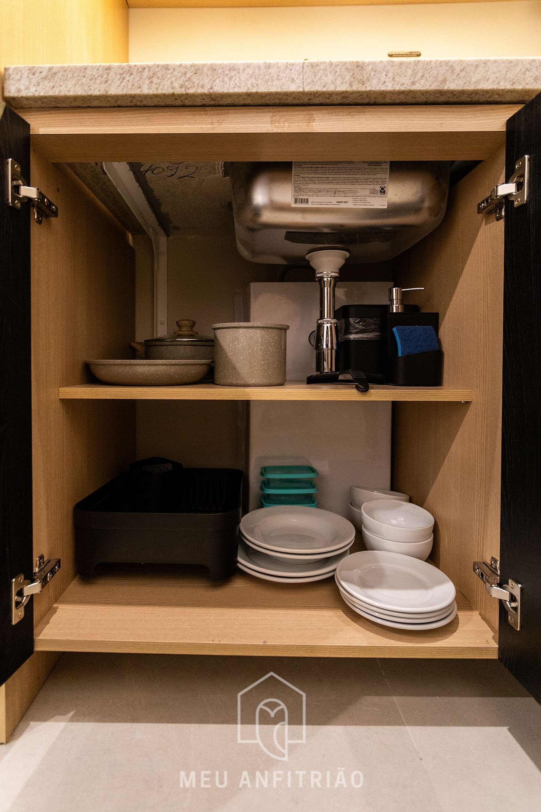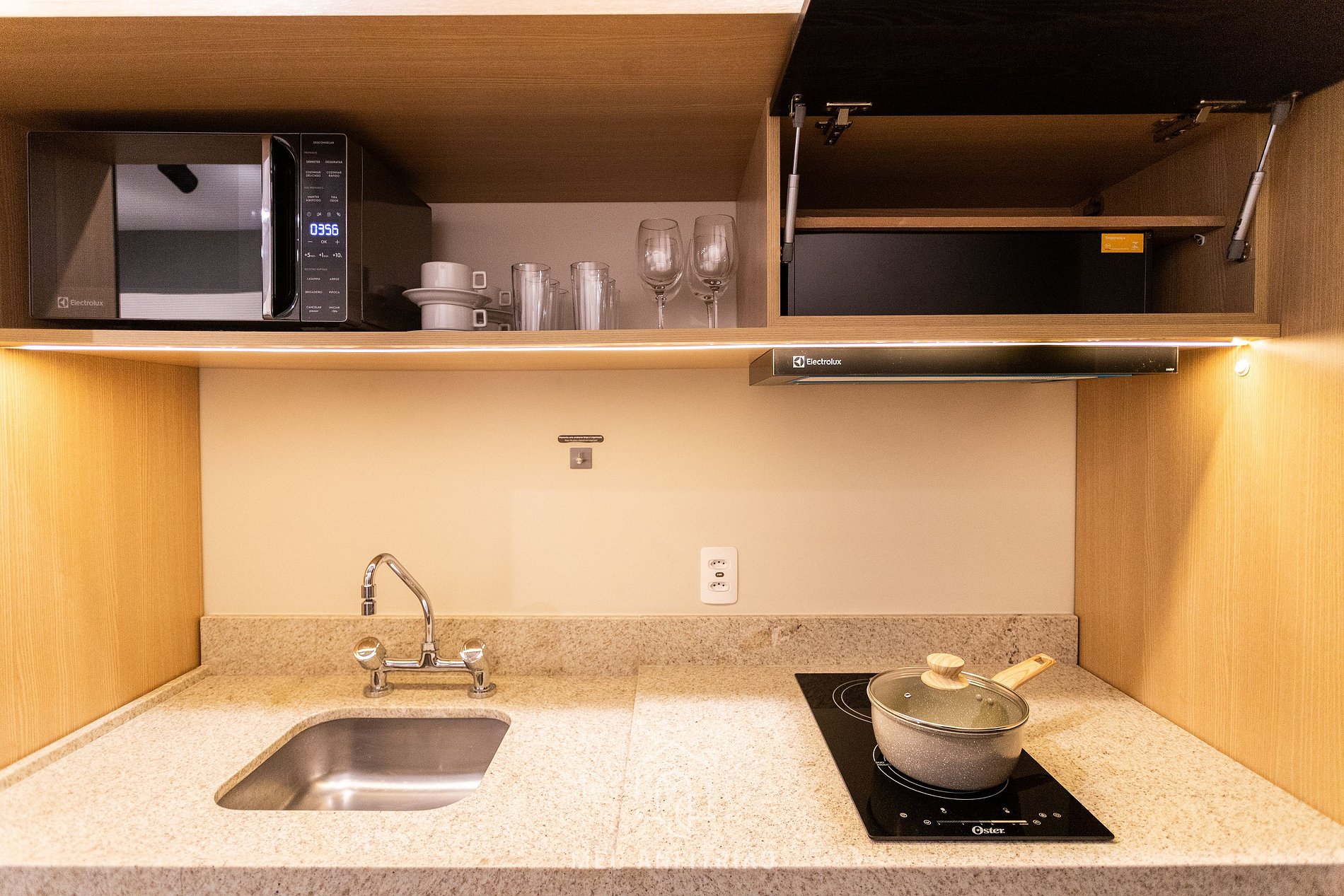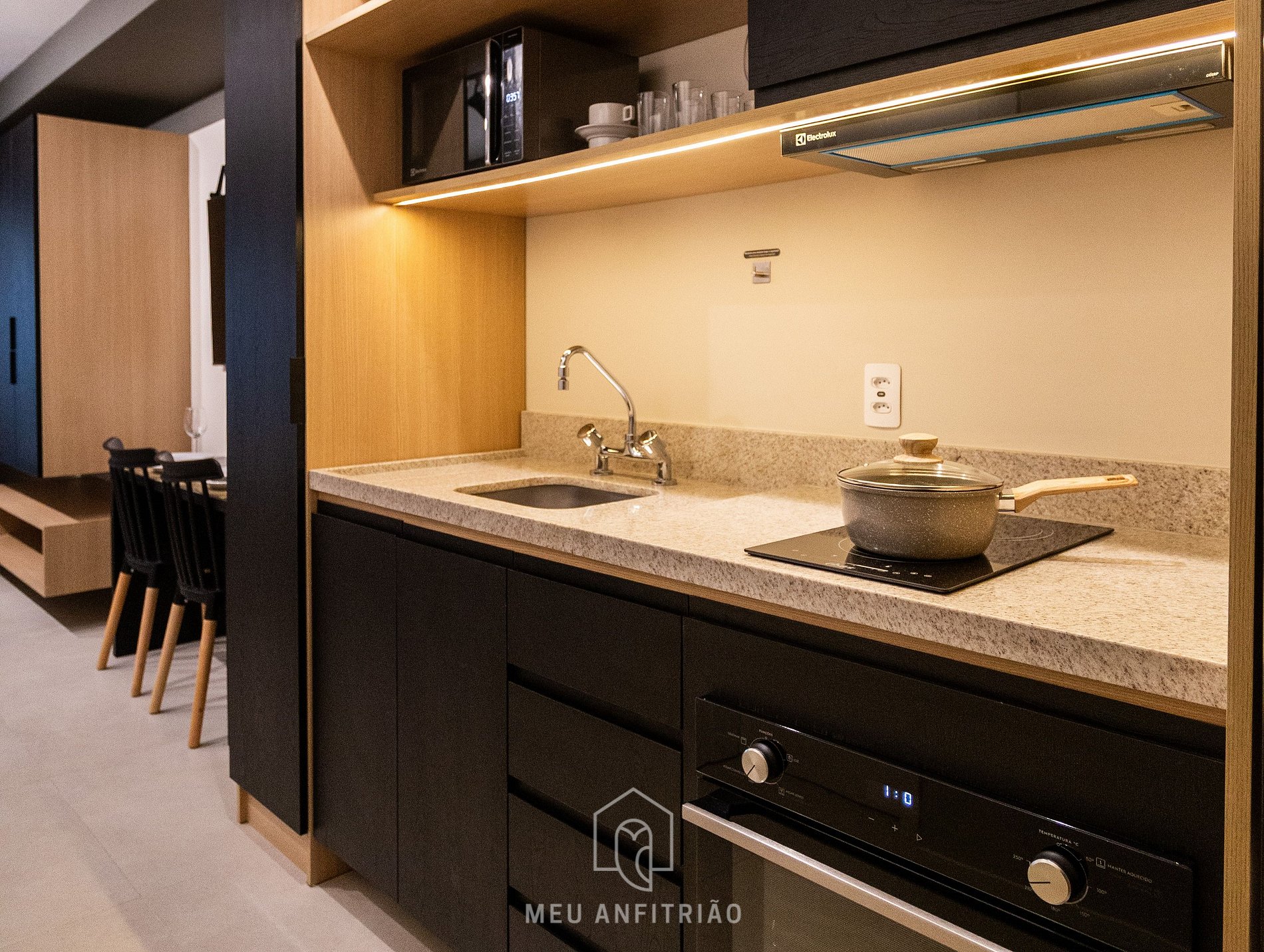 - Uma cozinha completa e equipada com geladeira, fogão cooktop, micro-ondas, forno, sanduicheira, liquidificador, cafeteira e chaleira elétricas entre outros.