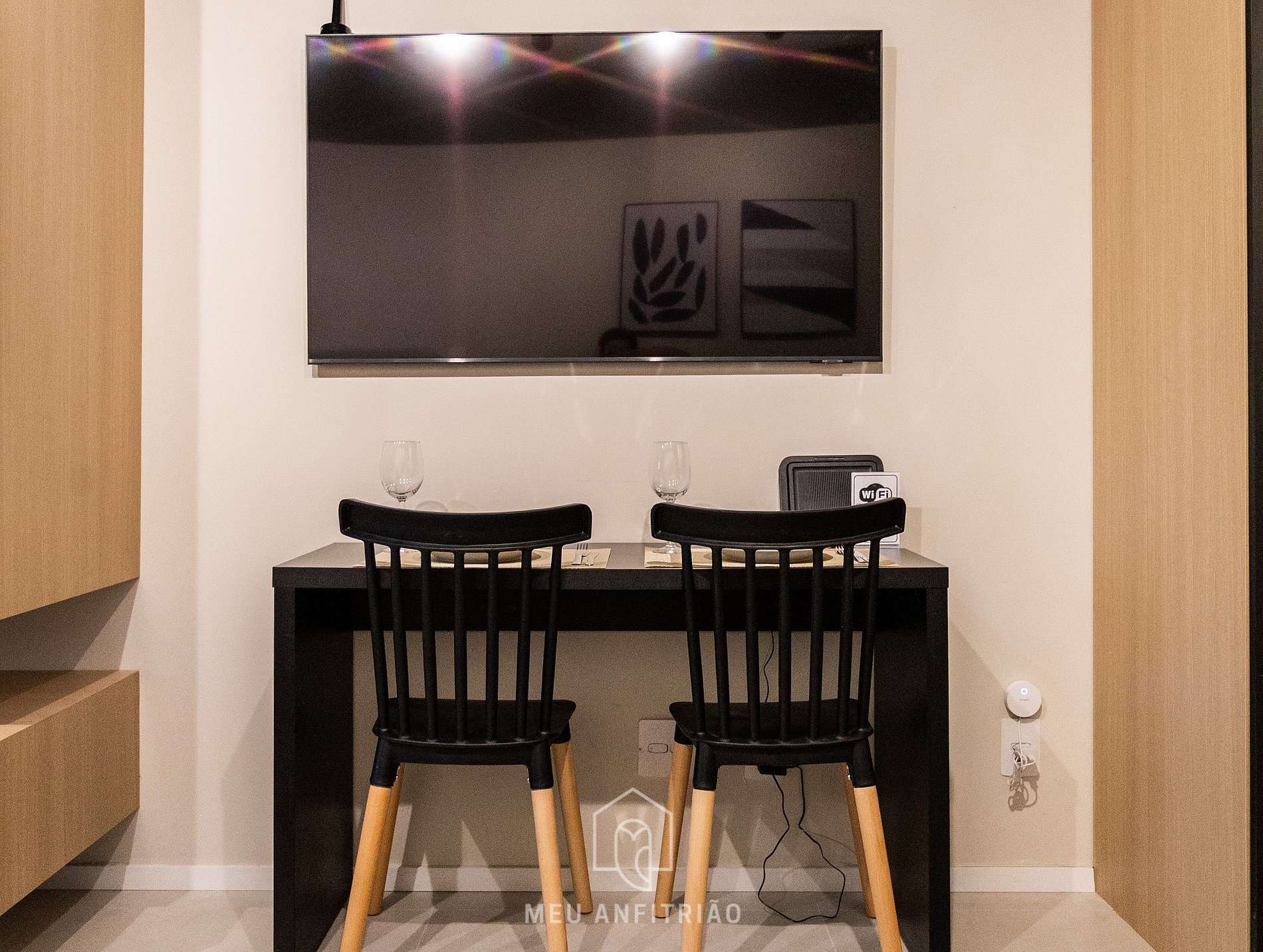 - Ambiente de quarto com cama queen, sofá, TV Smart Samsung, mesa com cadeiras para refeições ou home office, WI-FI de alta velocidade, ar-condicionado, steamer e guarda-roupas.