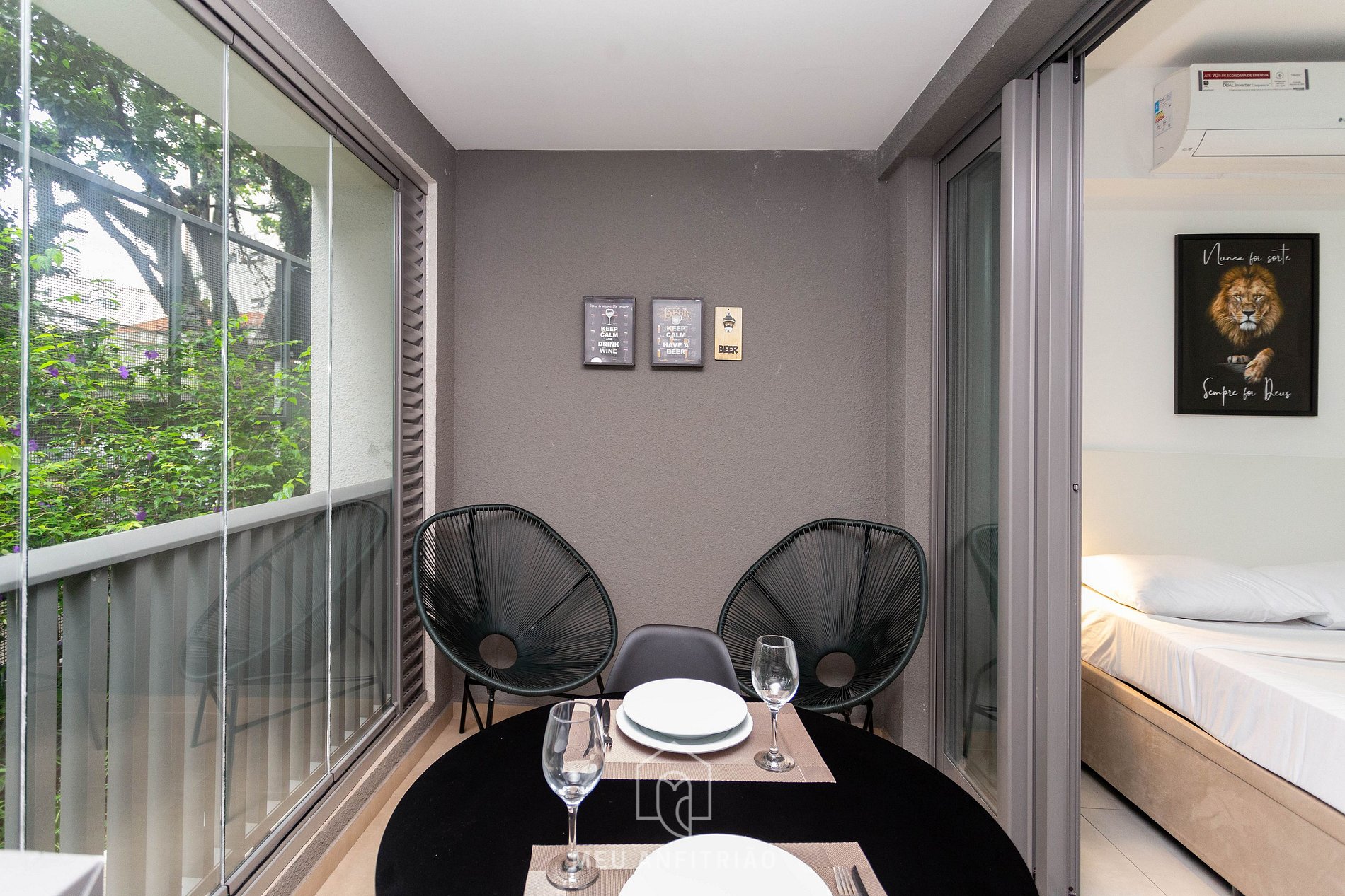 Para um ambiente mais aconchegante, contamos com cortina blackout na divisão do quarto para a varanda.