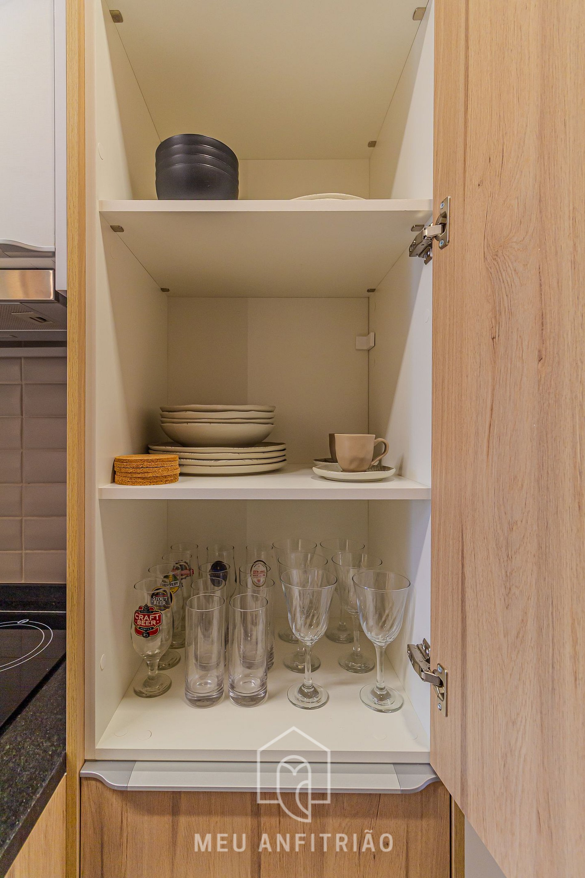 O hóspede estará na cozinha assim que entrar no studio, que é equipada com os itens ideais para uma estadia funcional, como geladeira, fogão cooktop, forno elétrico, micro-ondas, filtro d’água, coifa, sanduicheira, liquidificador, chaleira e cafeteira elétricas entre outros, além de uma mesa com cadeiras para refeições e uma área para café com cafeteira Dolce Gusto.