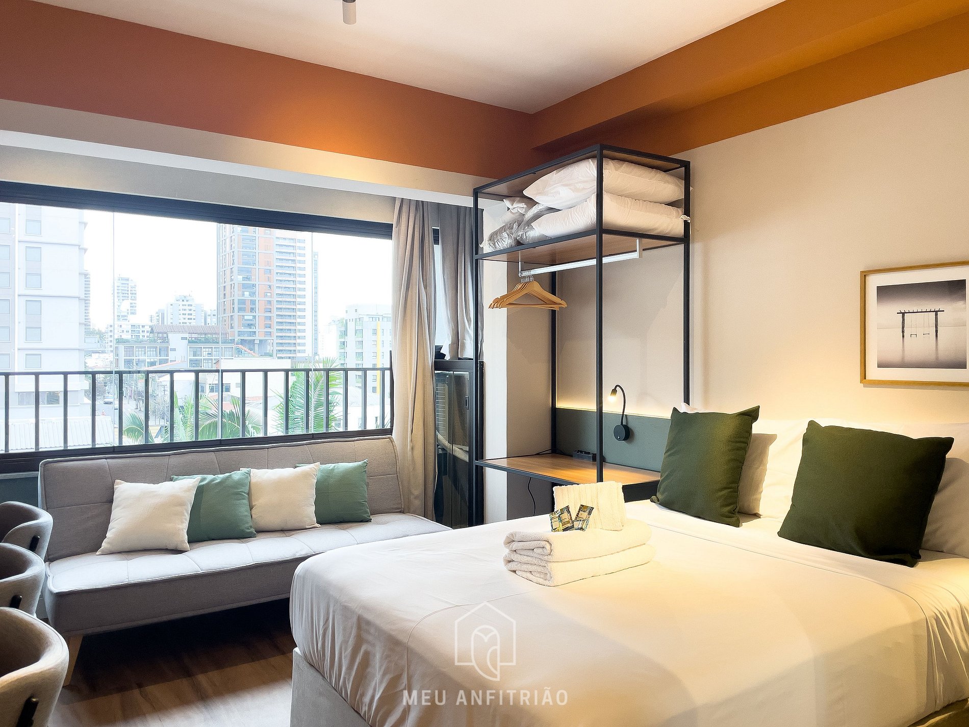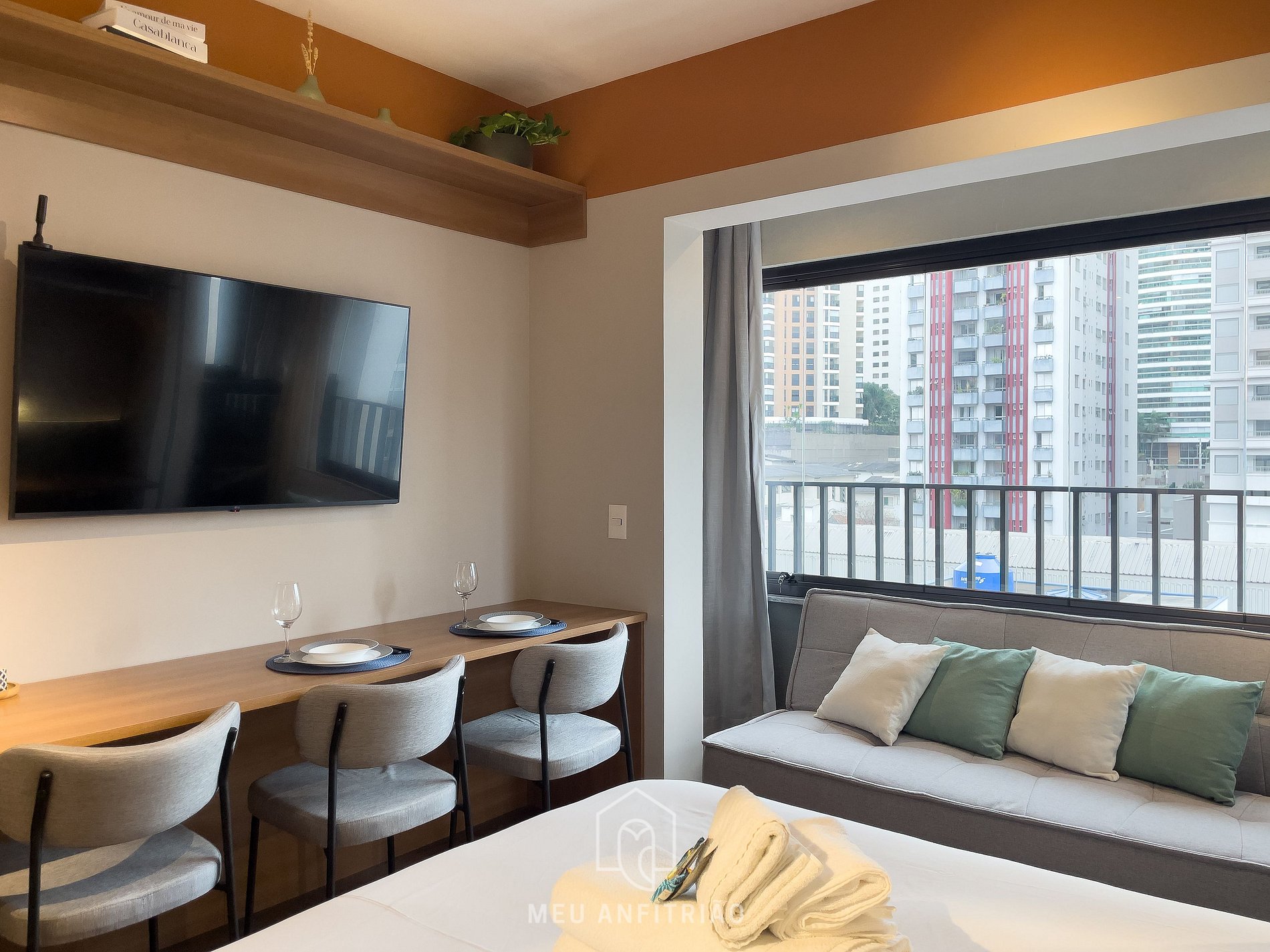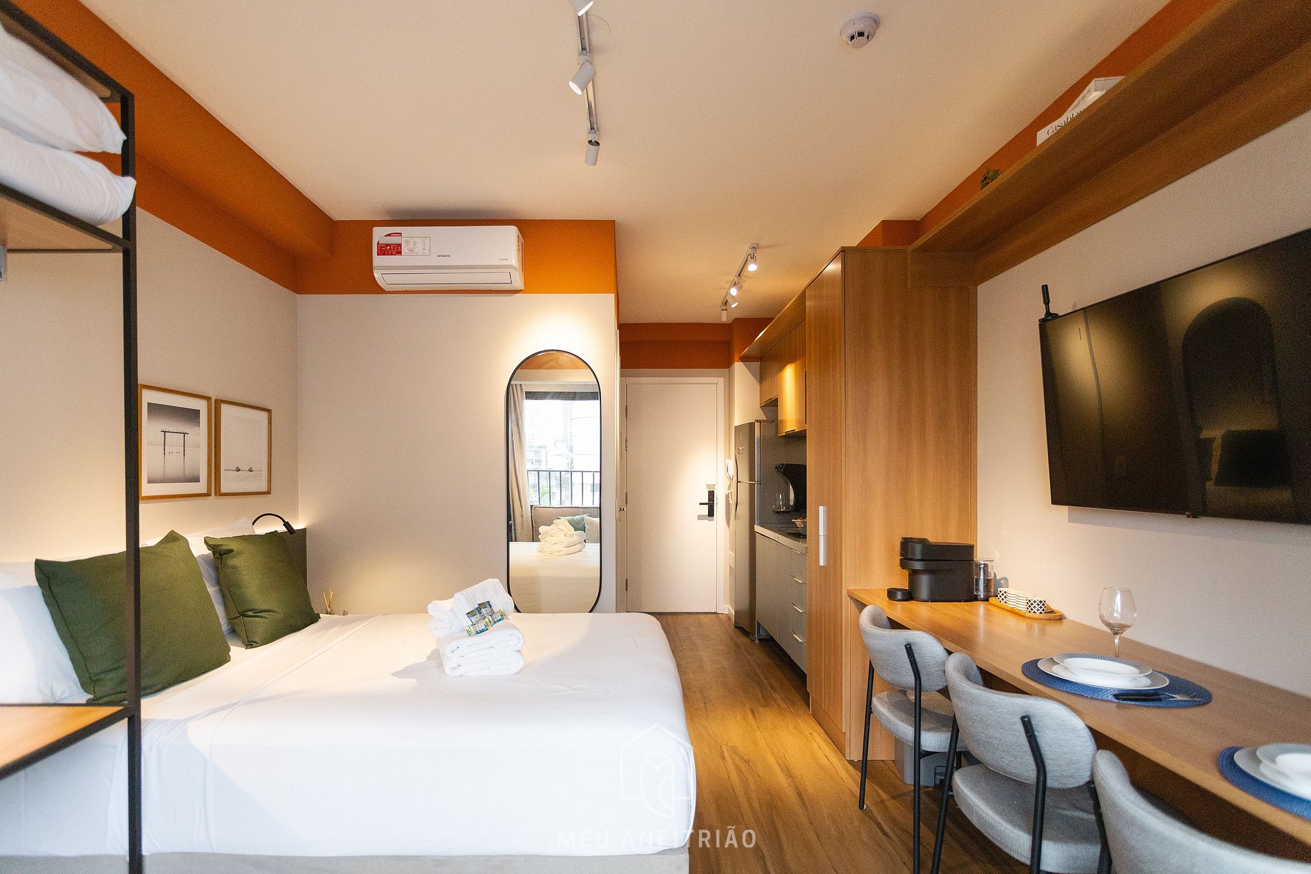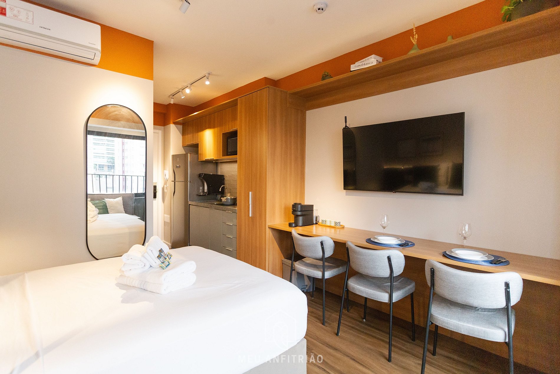 O espaço também oferece uma bancada com cadeiras para refeições ou home office, ar-condicionado, TV Smart LG, ferro de passar, guarda-roupas, WI-FI de alta velocidade, detector de fumaça e monóxido de carbono e banheiro com chuveiro elétrico e secador de cabelo.