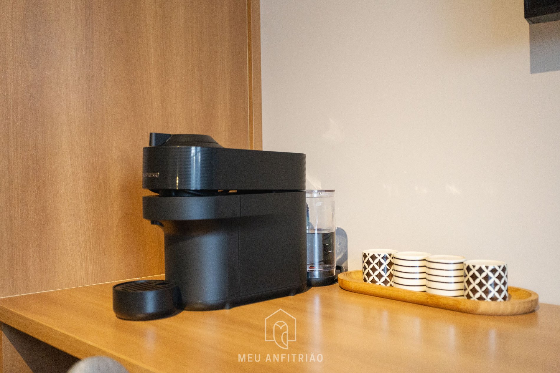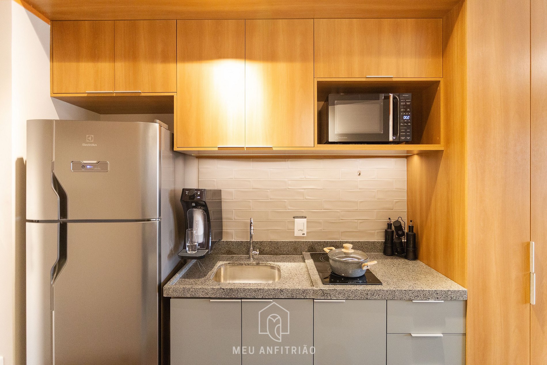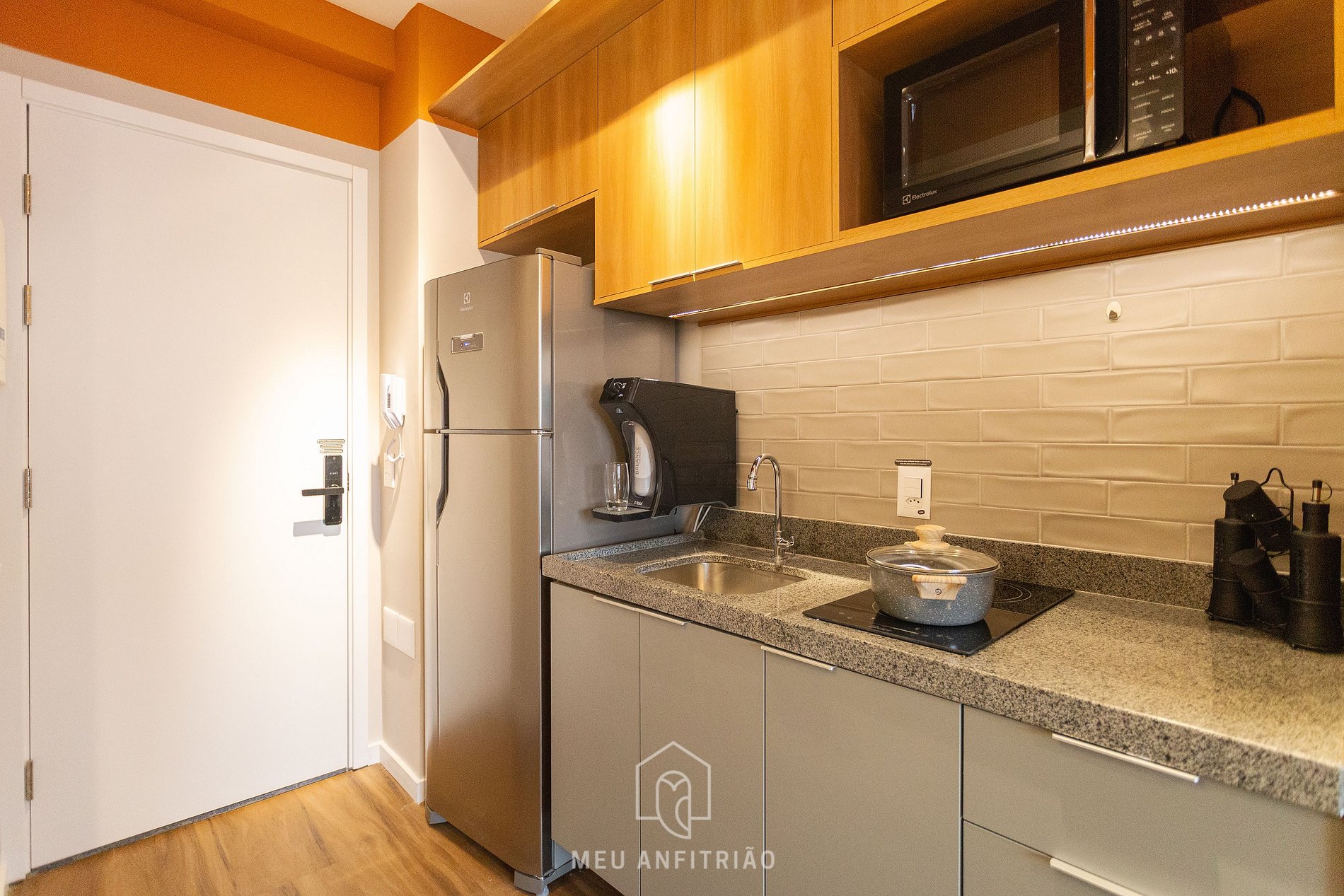 Entrando no studio, o hóspede acessa a cozinha, equipada com geladeira, fogão cooktop, micro-ondas, filtro d’água, sanduicheira, chaleira, air fryer, cafeteira elétrica, cafeteira Nespresso Vertuo POP, mixer entre outros.