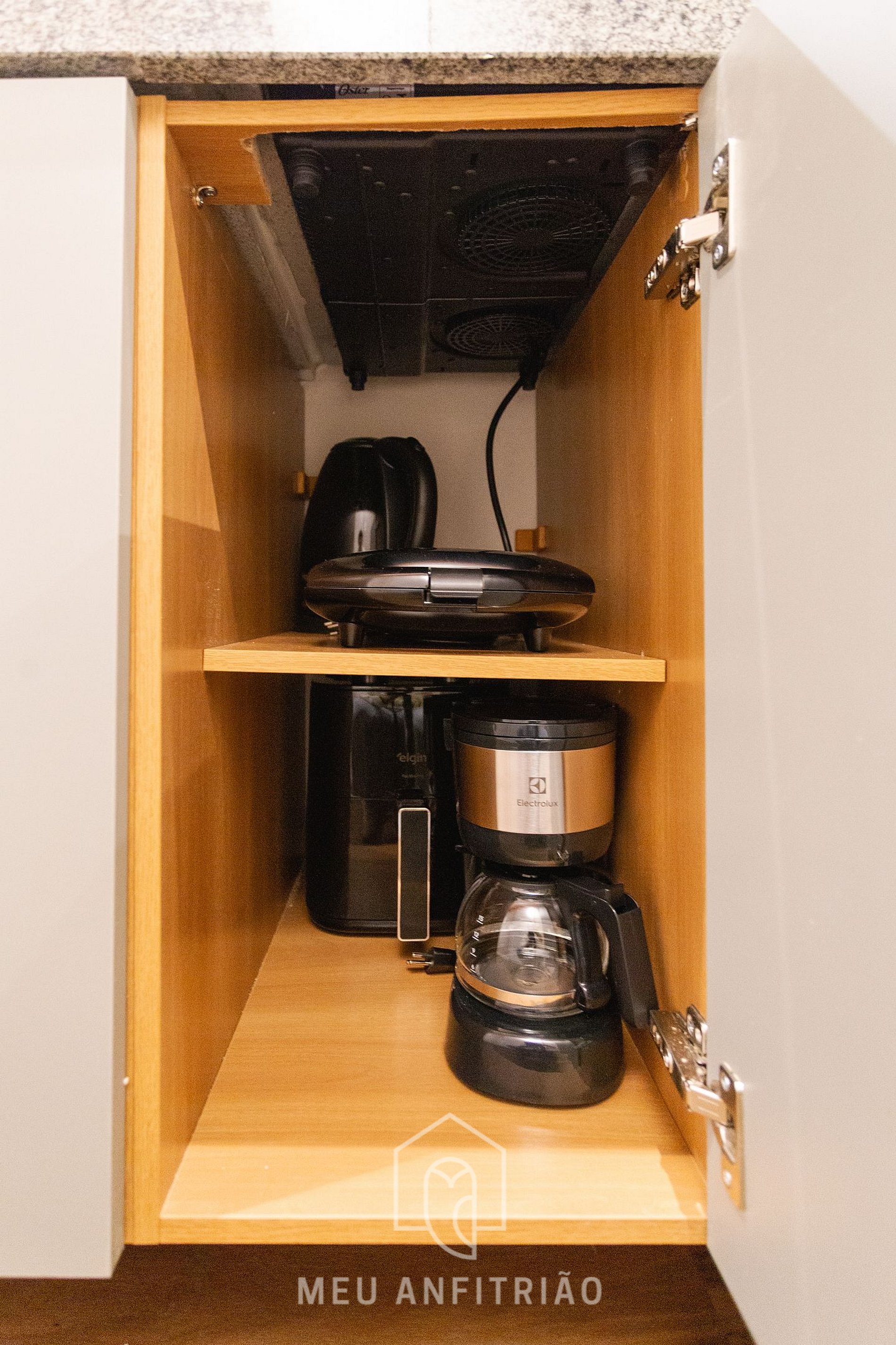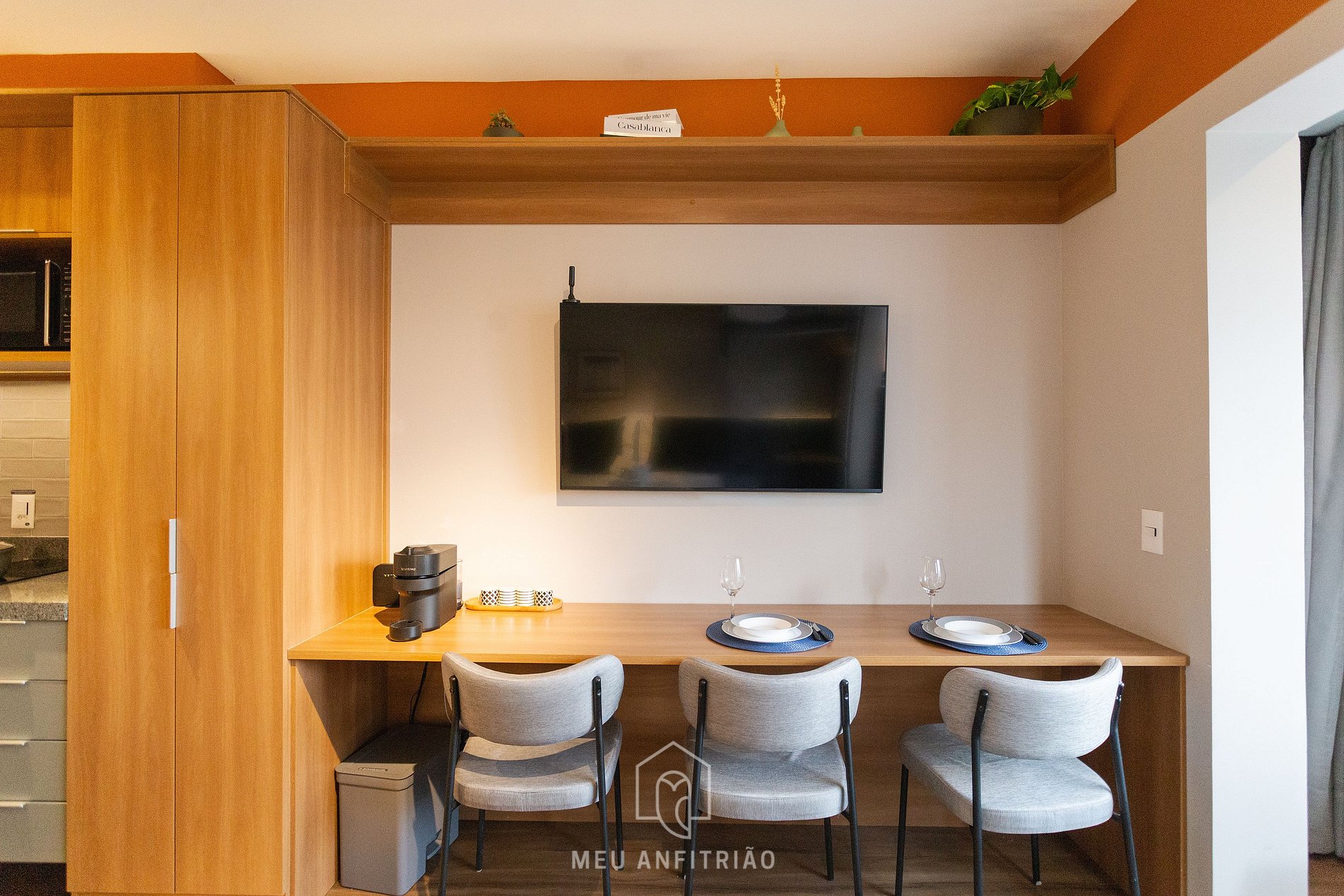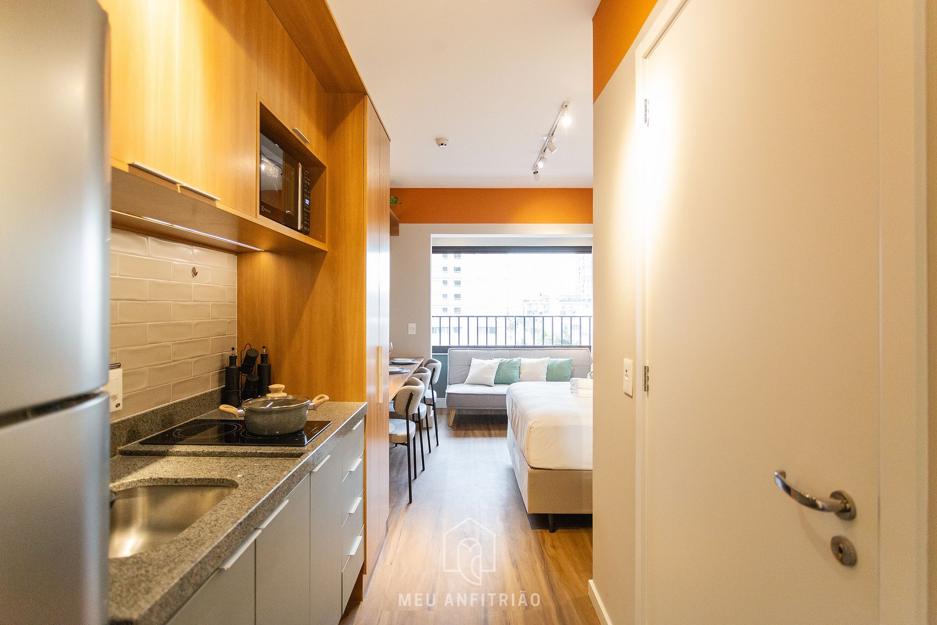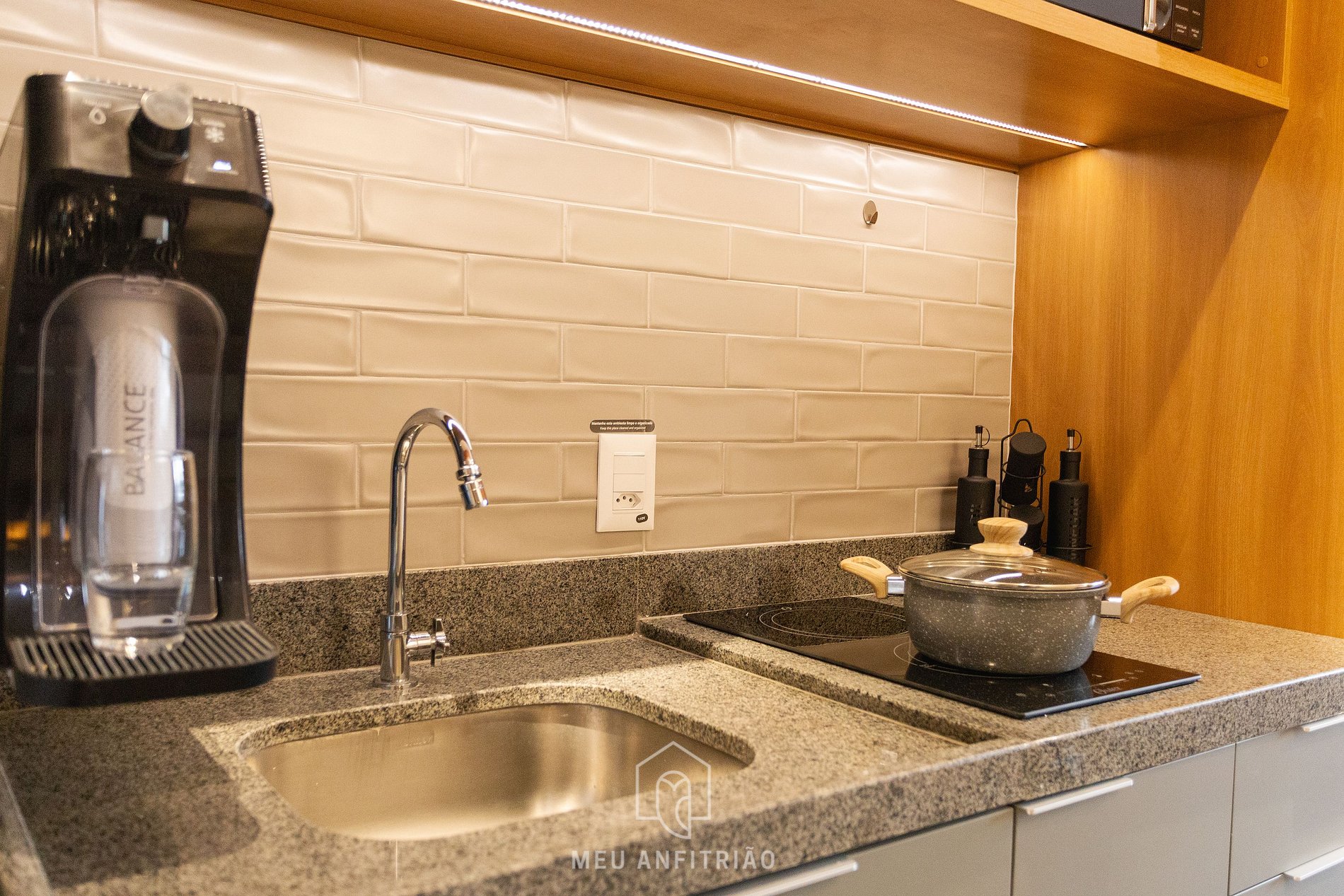 Entrando no studio, o hóspede acessa a cozinha, equipada com geladeira, fogão cooktop, micro-ondas, filtro d’água, sanduicheira, chaleira, air fryer, cafeteira elétrica, cafeteira Nespresso Vertuo POP, mixer entre outros.