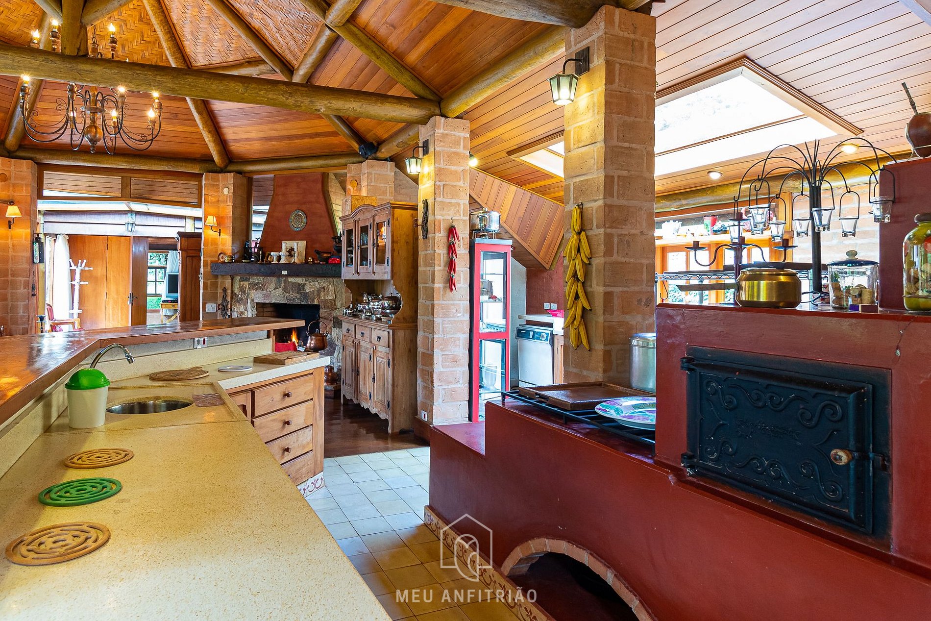 Em frente a este espaço, temos uma cozinha completa com os utensílios necessários para a estadia. O local é ideal para aproveitar os dias em família ou amigos que podem estar hospedados nos outros chalés.