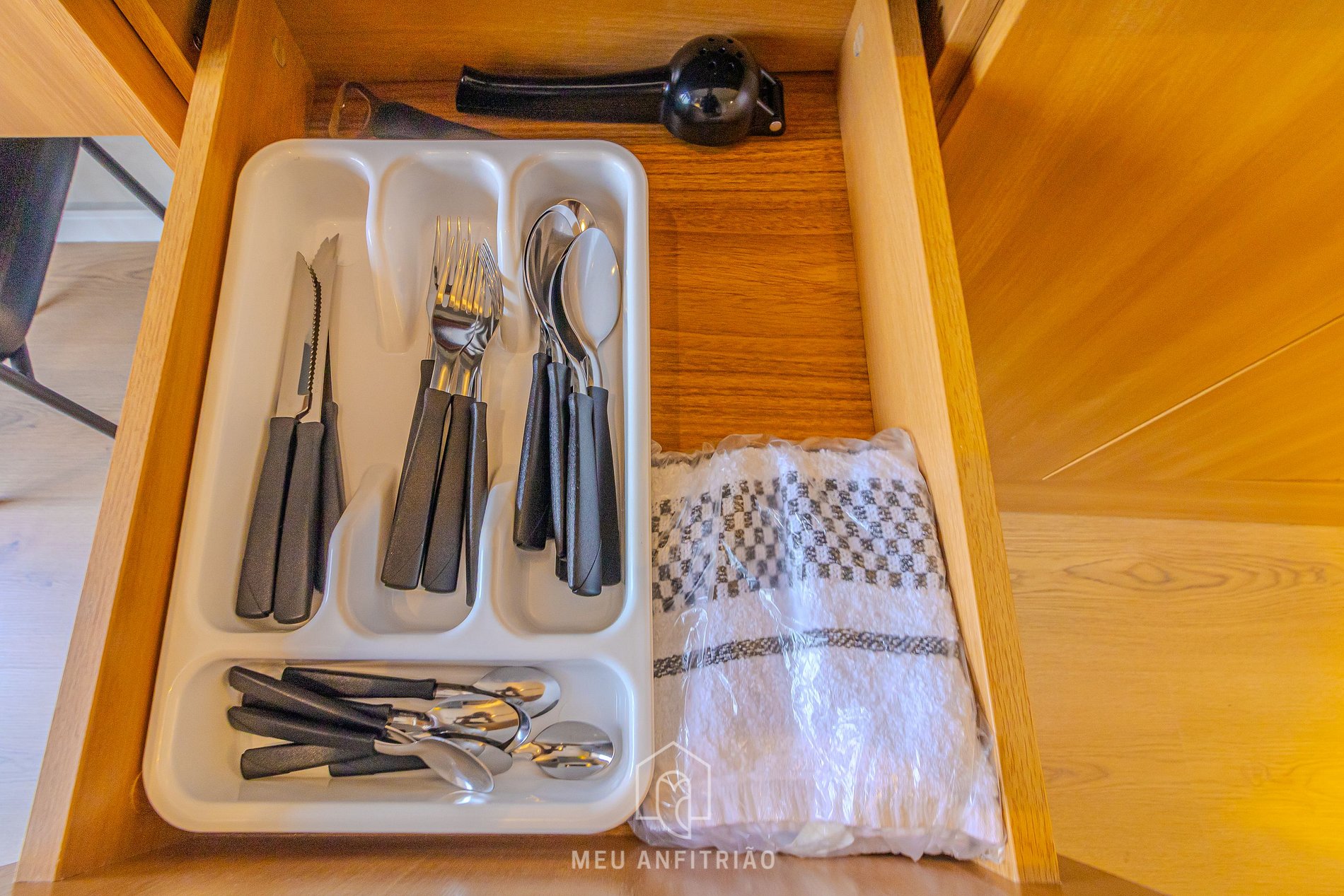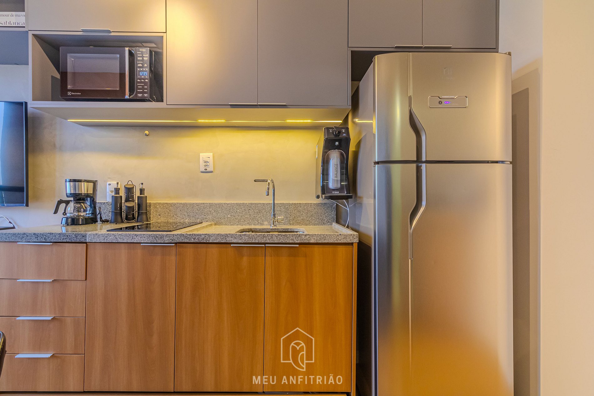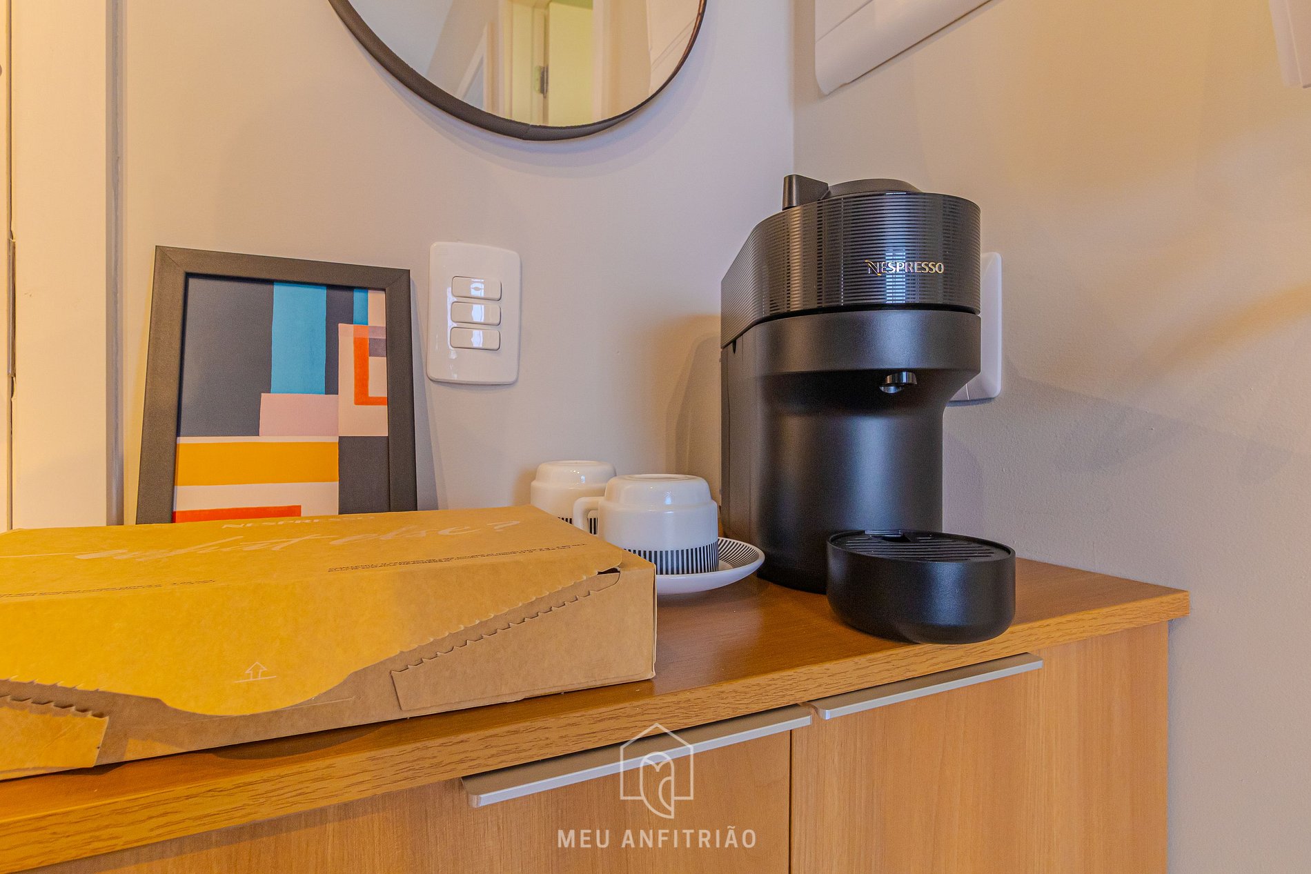 Entrando no apartamento, o hóspede estará na cozinha, que dispõe dos utensílios necessários para uma estadia prática e cotidiana, como geladeira, fogão cooktop, micro-ondas, filtro d’água, sanduicheira, mixer, cafeteira Nespresso Vertuo POP, air fryer, chaleira entre outros.