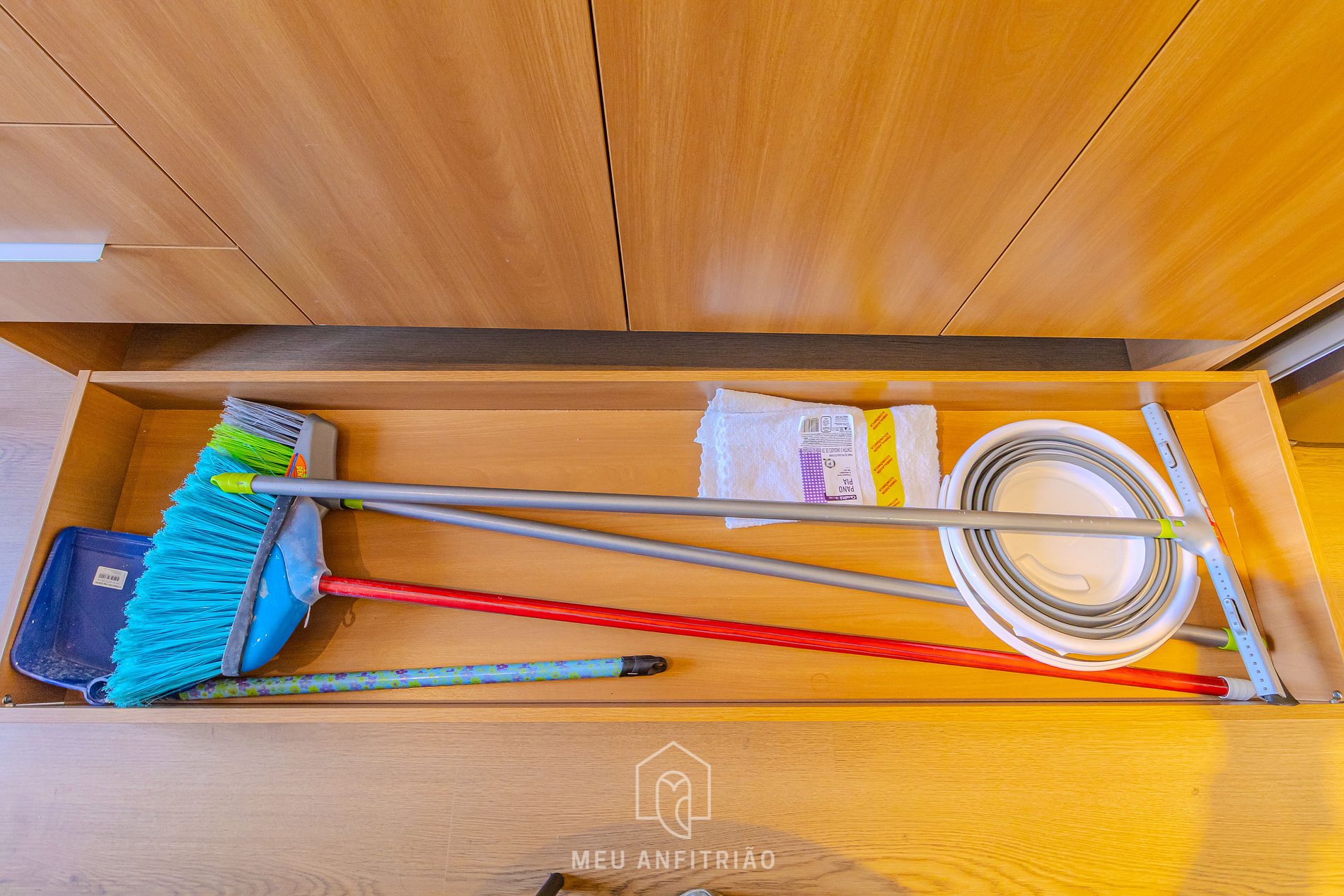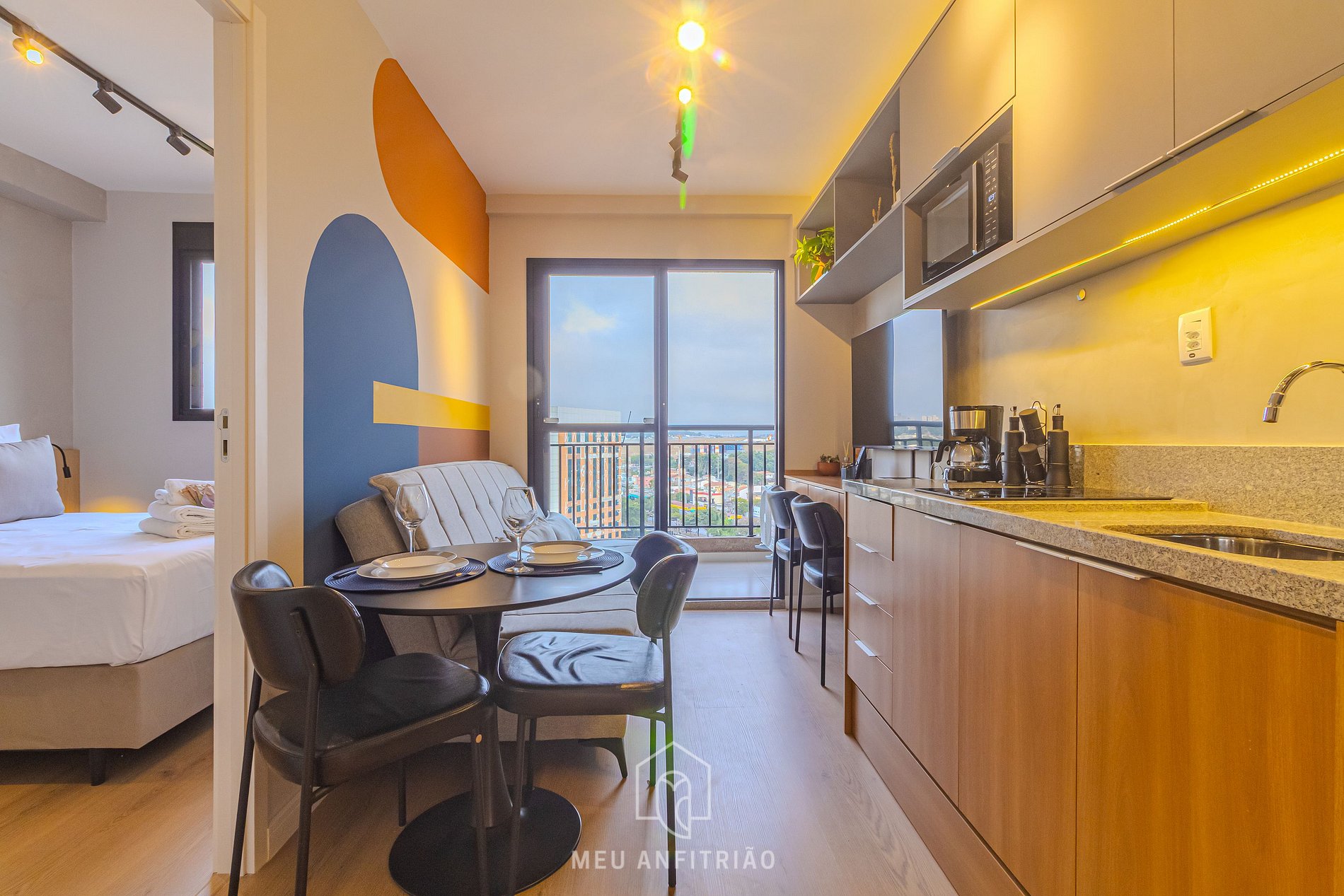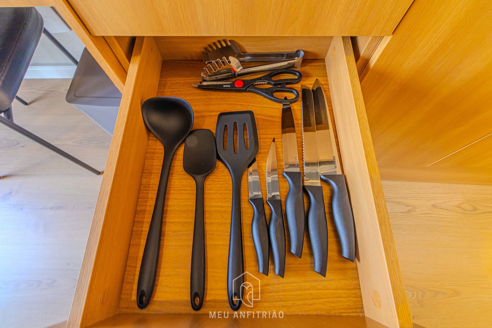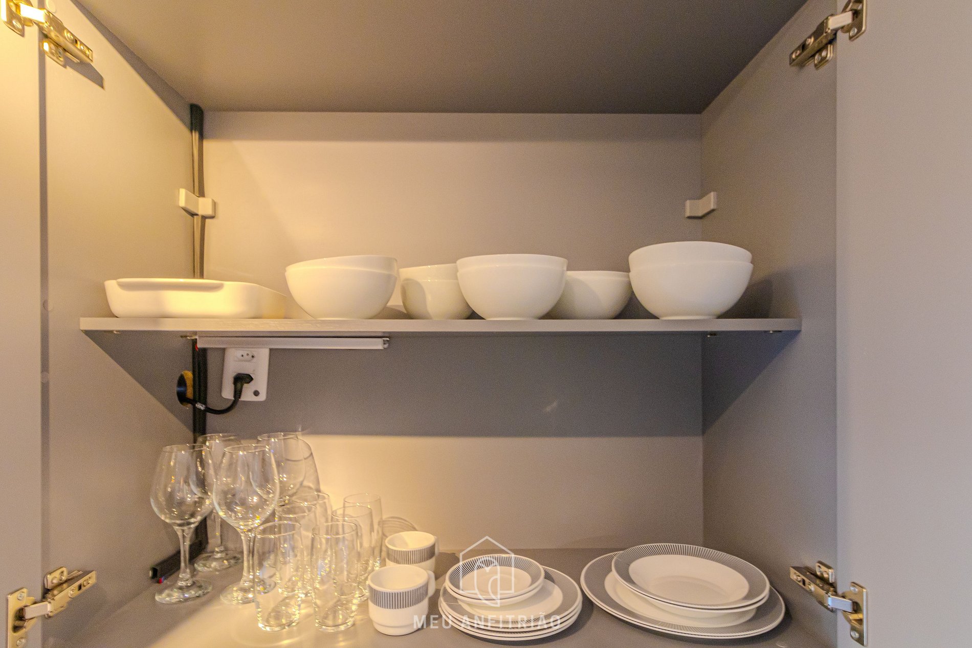 Entrando no apartamento, o hóspede estará na cozinha, que dispõe dos utensílios necessários para uma estadia prática e cotidiana, como geladeira, fogão cooktop, micro-ondas, filtro d’água, sanduicheira, mixer, cafeteira Nespresso Vertuo POP, air fryer, chaleira entre outros.