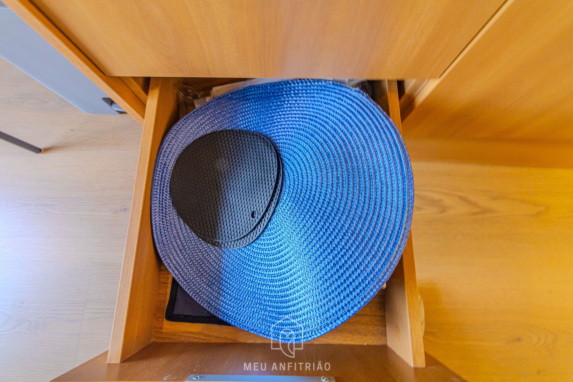 No quarto, além da cama de casal, temos um guarda-roupas e janelas de vidro com venezianas blackout.