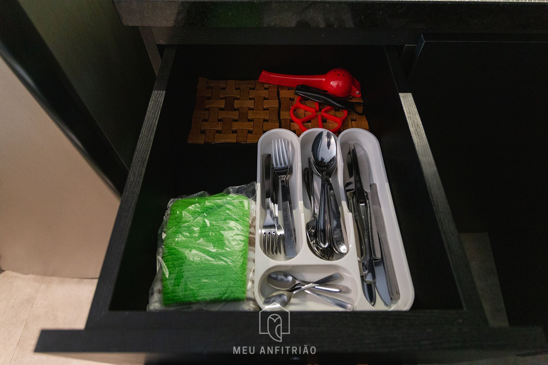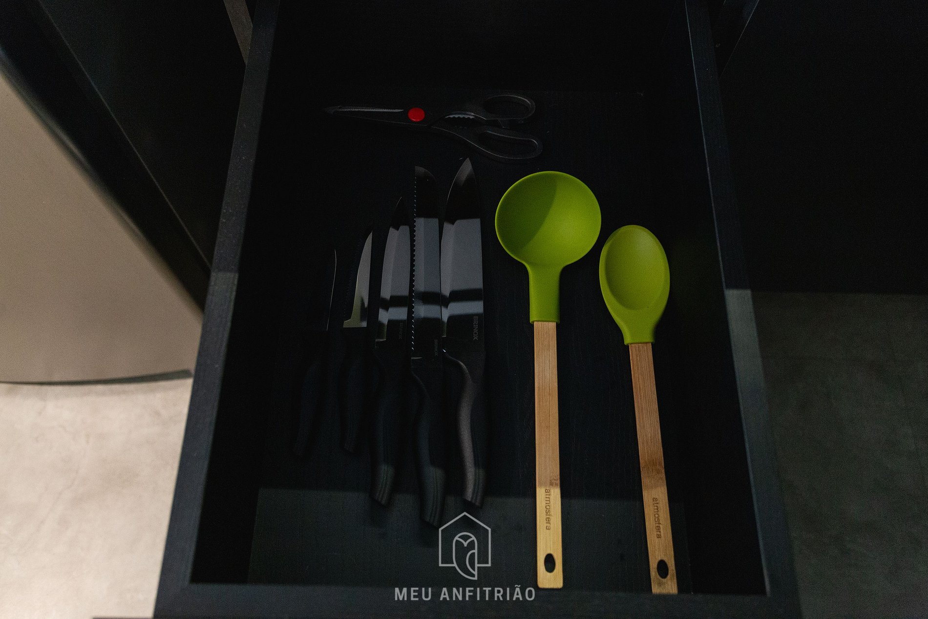 A cozinha conta com os itens necessários para uma estadia confortável, como geladeira, fogão cooktop, micro-ondas, air fryer, sanduicheira, liquidificador, cafeteira e chaleira elétricas entre outros, além de uma extensa mesa com cadeiras para refeições ou home office.
