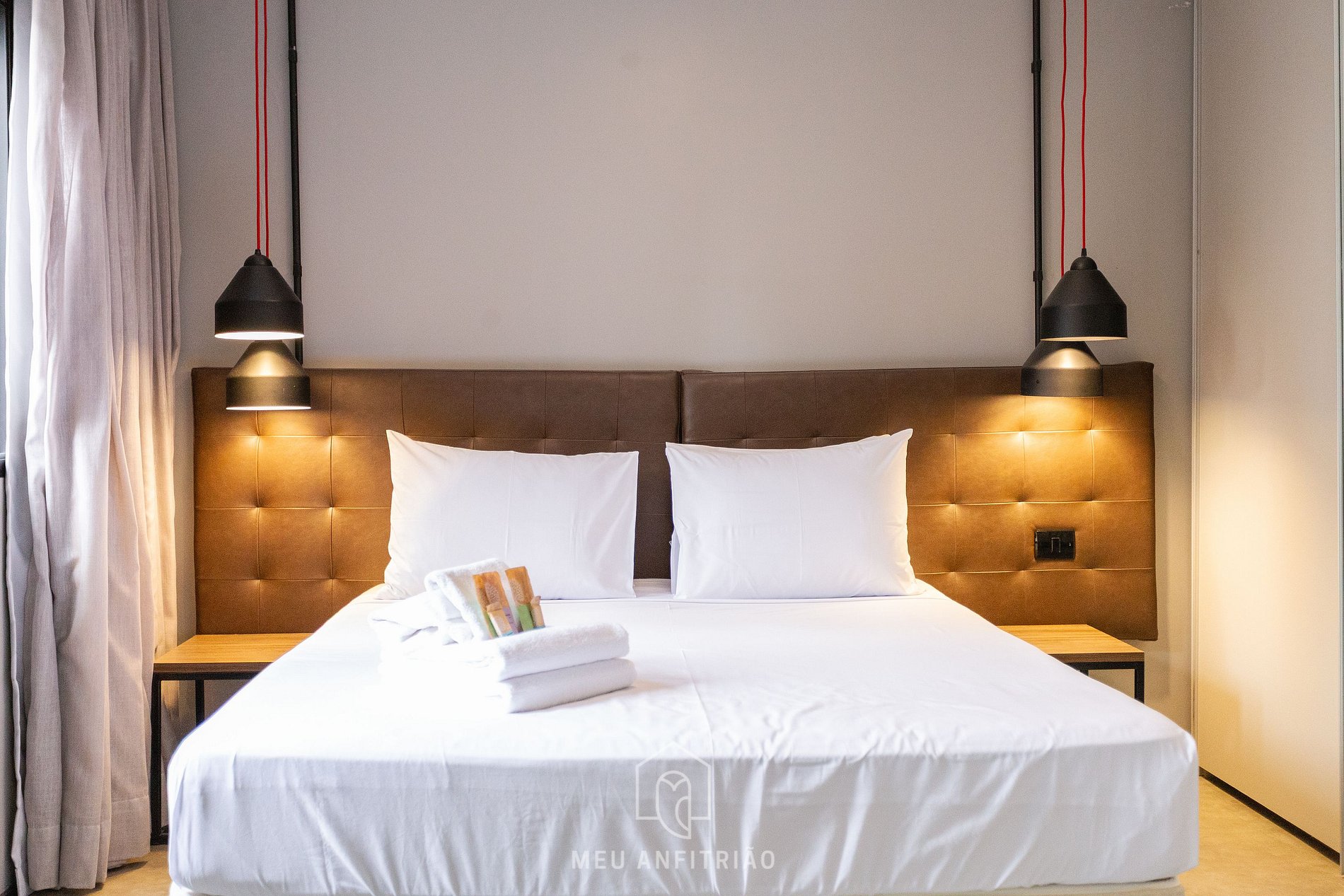 Nosso studio é em conceito aberto com um amplo espaço de 40m², acomodando 2 pessoas em uma cama de casal. Estamos situados em um prédio com área de lazer completa e recepção presencial 24h.