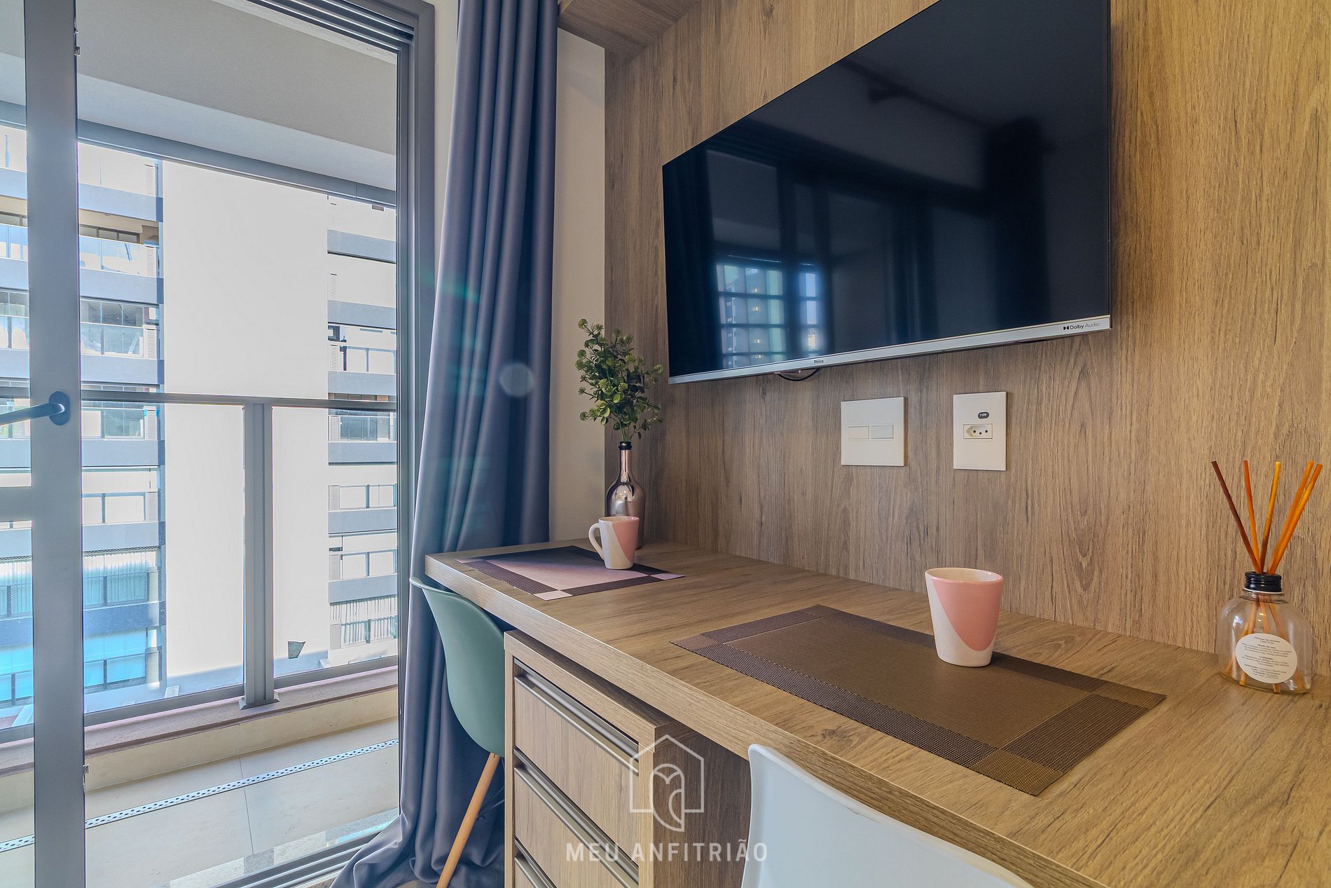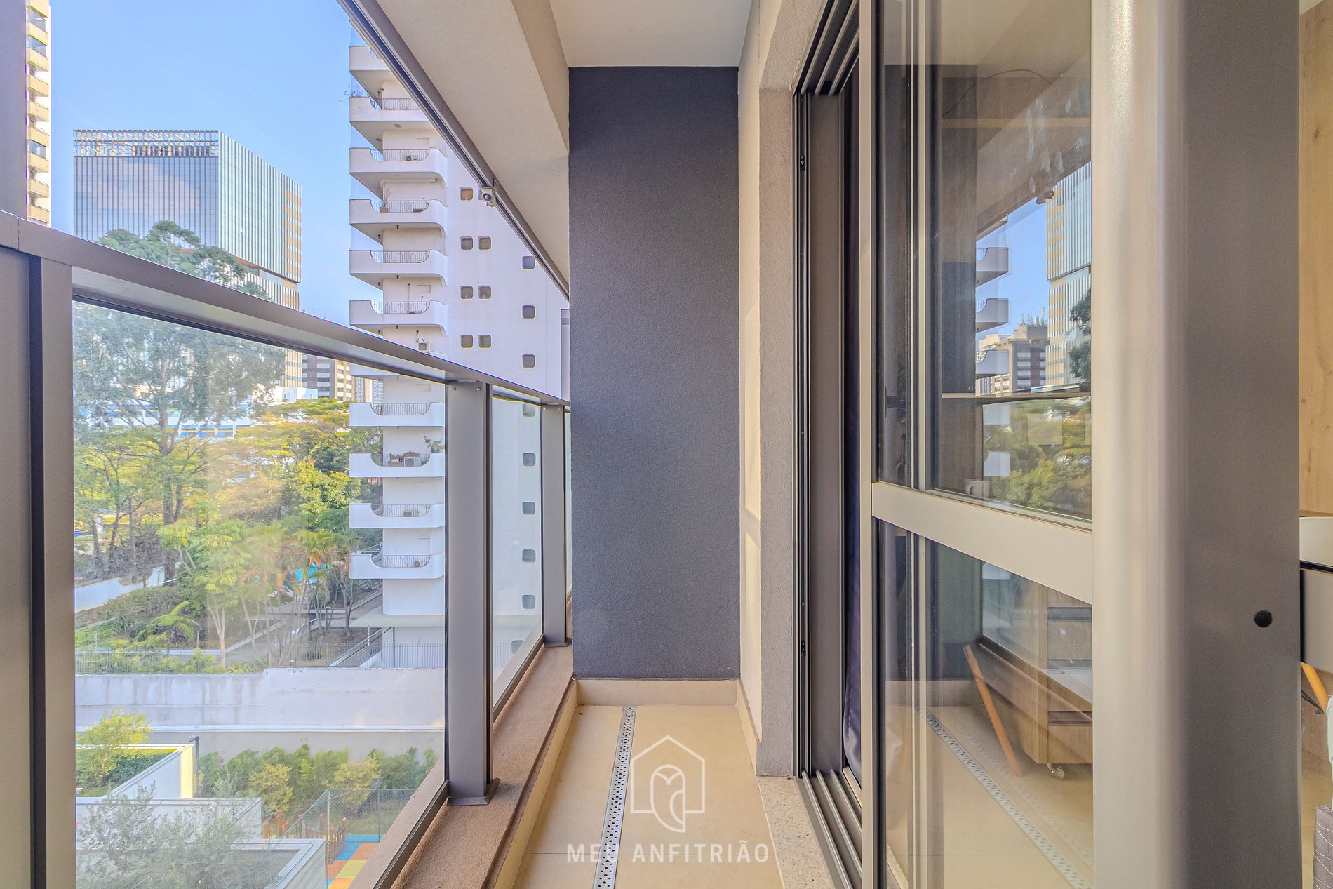 A varanda conta com uma porta de vidro com isolamento acústico e cortinas blackout, além de vista para a cidade.
