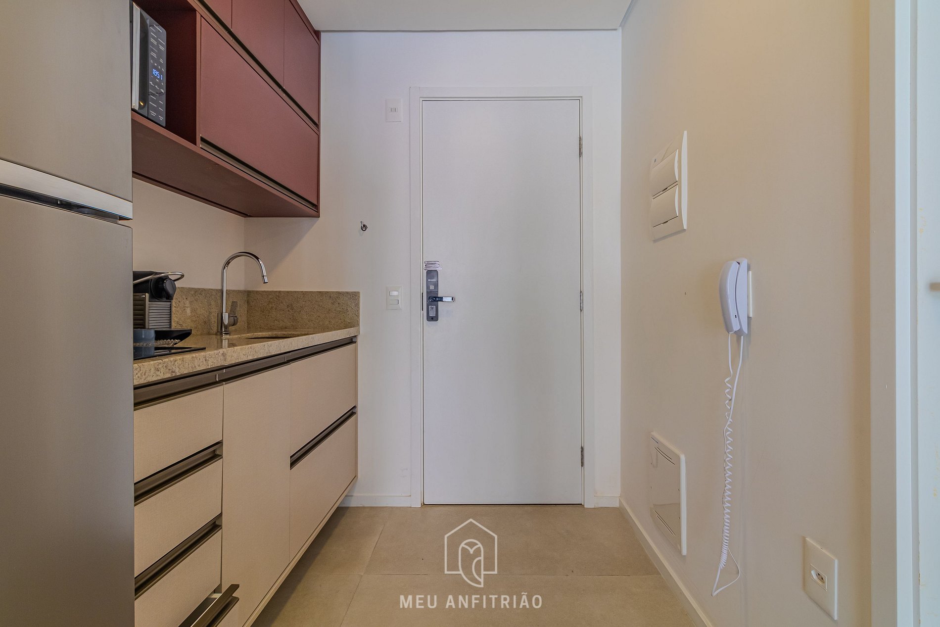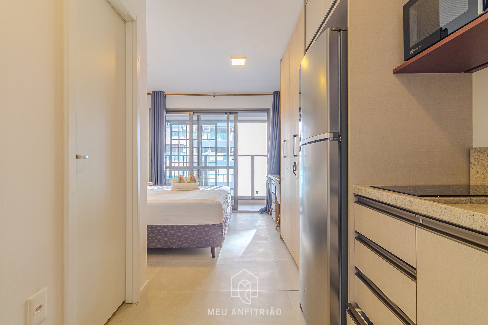 Ao entrar no studio, o hóspede estará na cozinha, que conta com fogão cooktop, geladeira, micro-ondas, liquidificador, sanduicheira, chaleira elétrica, Cafeteira Nespresso Essenza Mini e outros utensílios necessários para uma estadia funcional.
