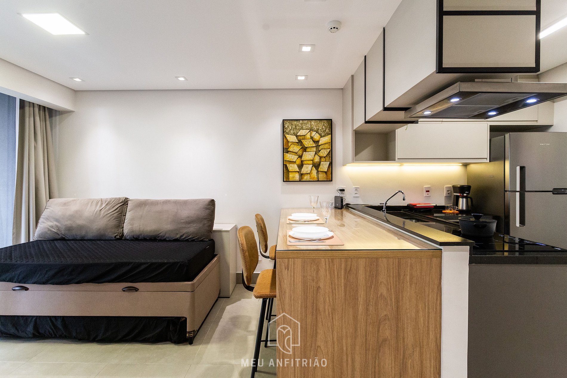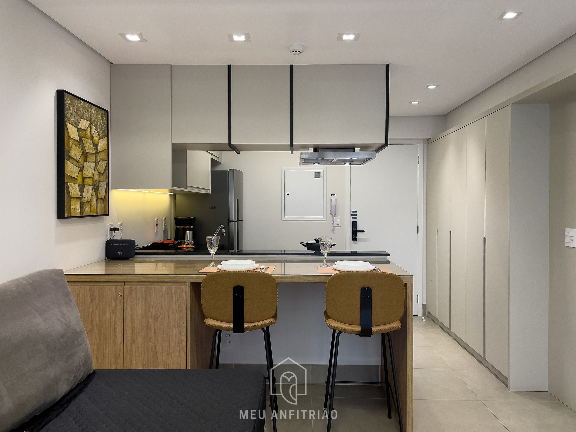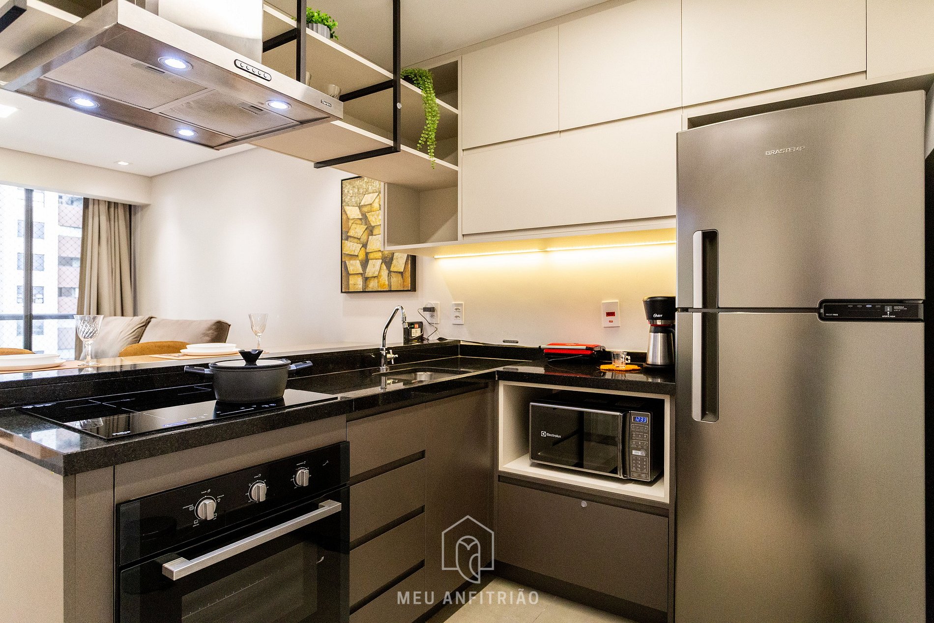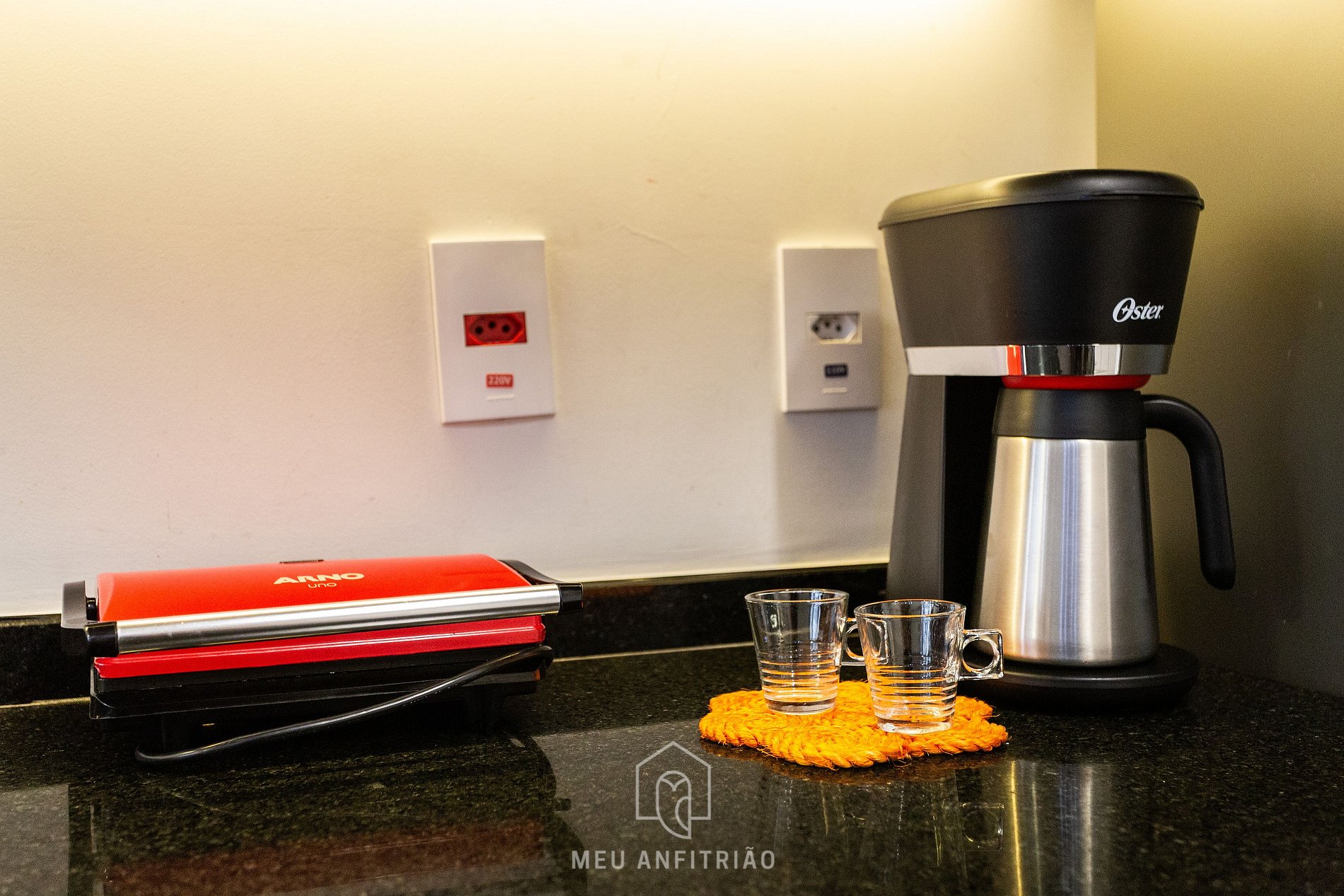 - Cozinha equipada com geladeira, fogão cooktop, micro-ondas, forno, depurador, filtro de água na torneira, cafeteira elétrica, liquidificador, sanduicheira e outros utensílios necessários para uma estadia confortável.