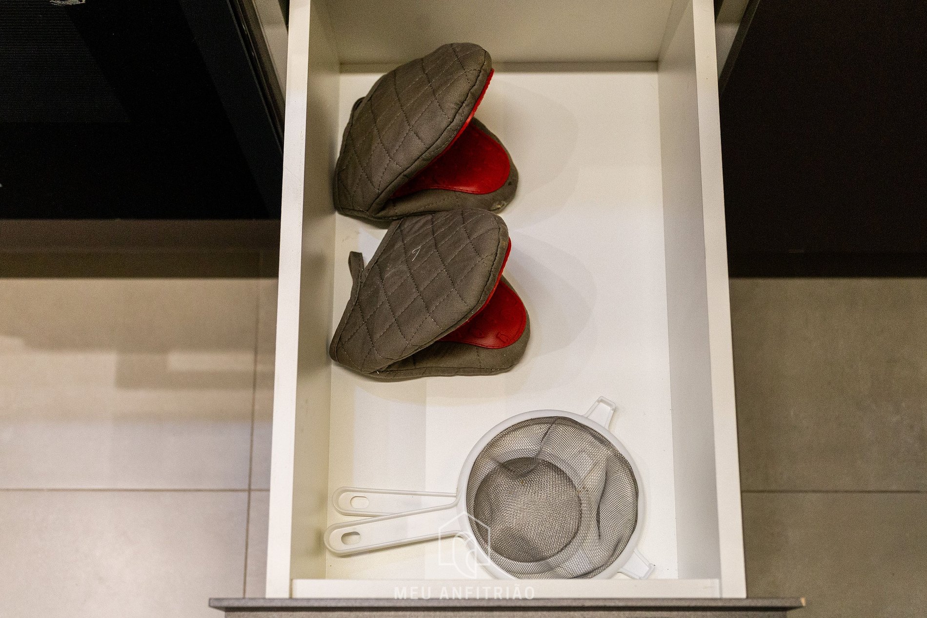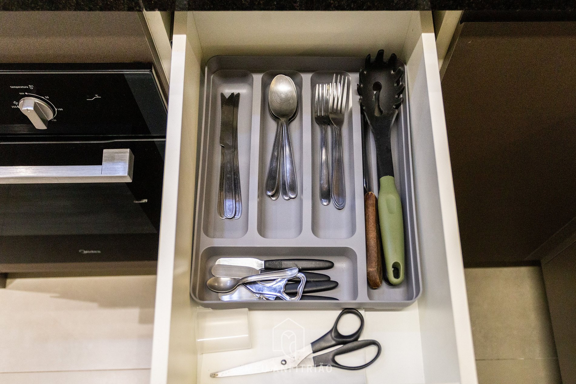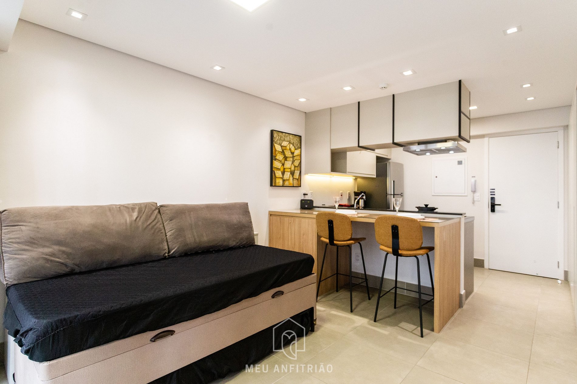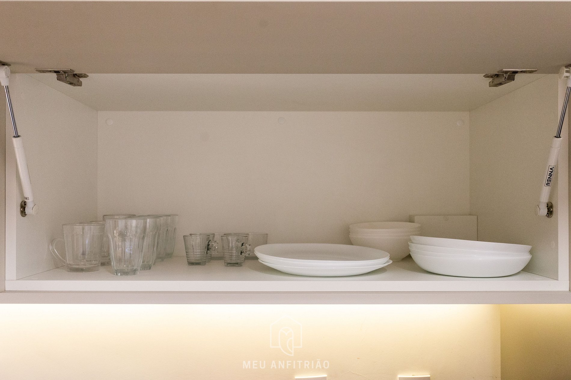 - Cozinha equipada com geladeira, fogão cooktop, micro-ondas, forno, depurador, filtro de água na torneira, cafeteira elétrica, liquidificador, sanduicheira e outros utensílios necessários para uma estadia confortável.