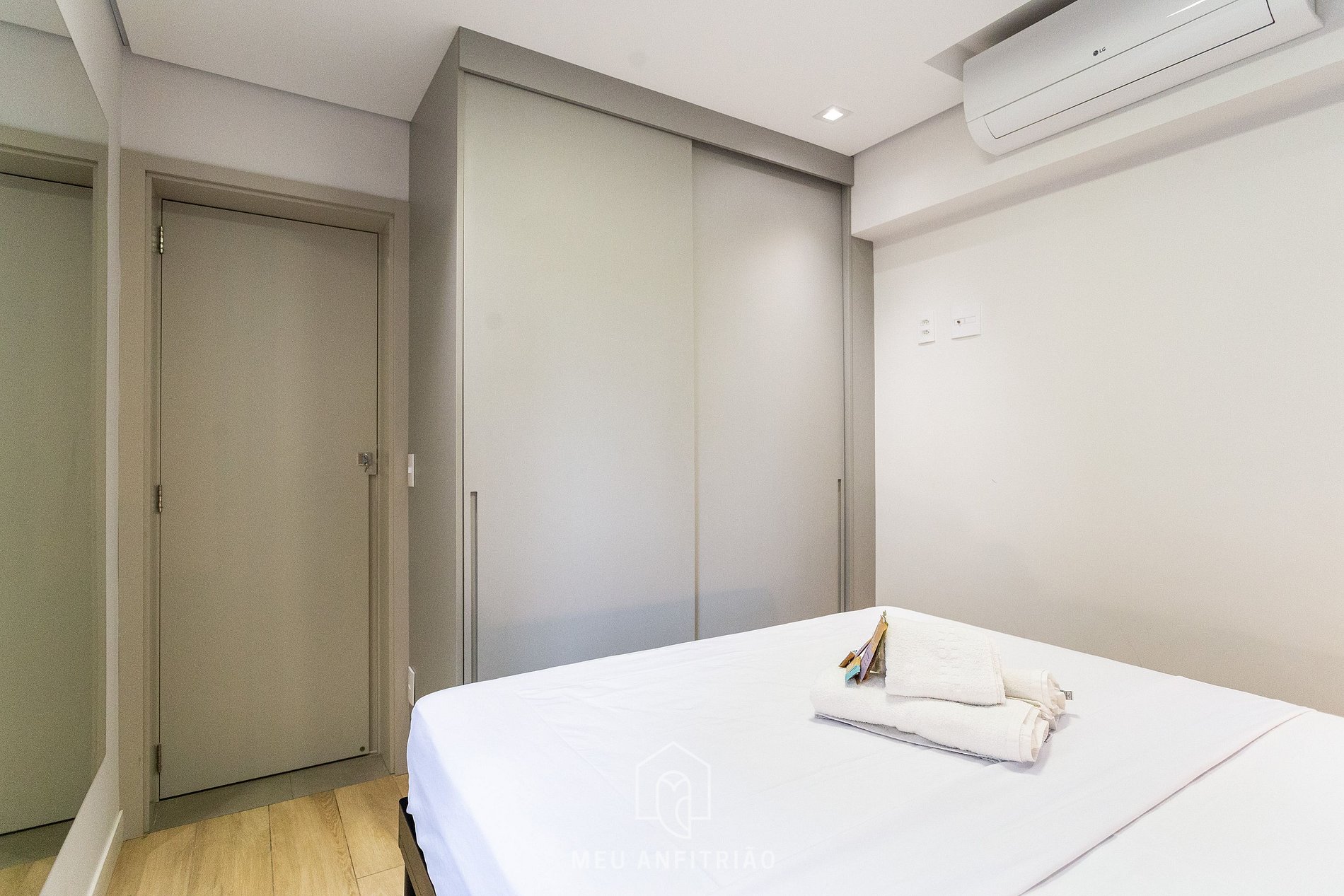 - Quarto com cama queen, armário, ar-condicionado e janelas com persianas blackout.