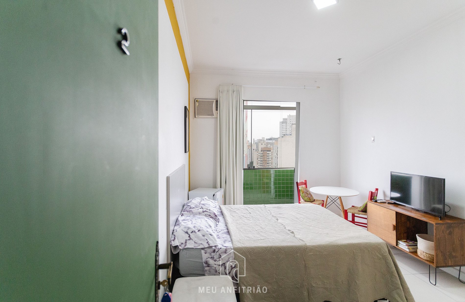 Nosso quarto conta com TV Smart, frigobar, ar-condicionado, ventilador, mesa com cadeiras para refeições ou home office e guarda-roupas com cabides. Também contamos com uma varanda com banco, cortinas blackout e vista para o Minhocão.