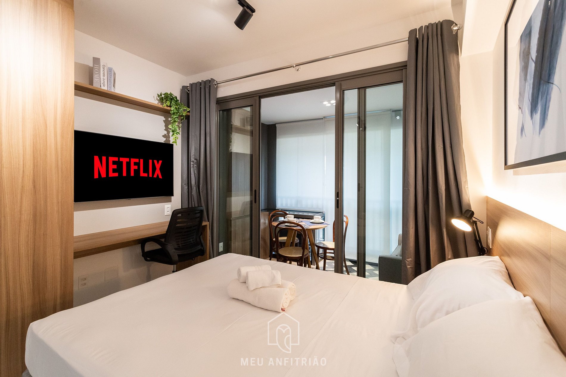 O ambiente do studio é em conceito aberto e acomoda até 3 pessoas em cama de casal e uma cama auxiliar de solteiro.