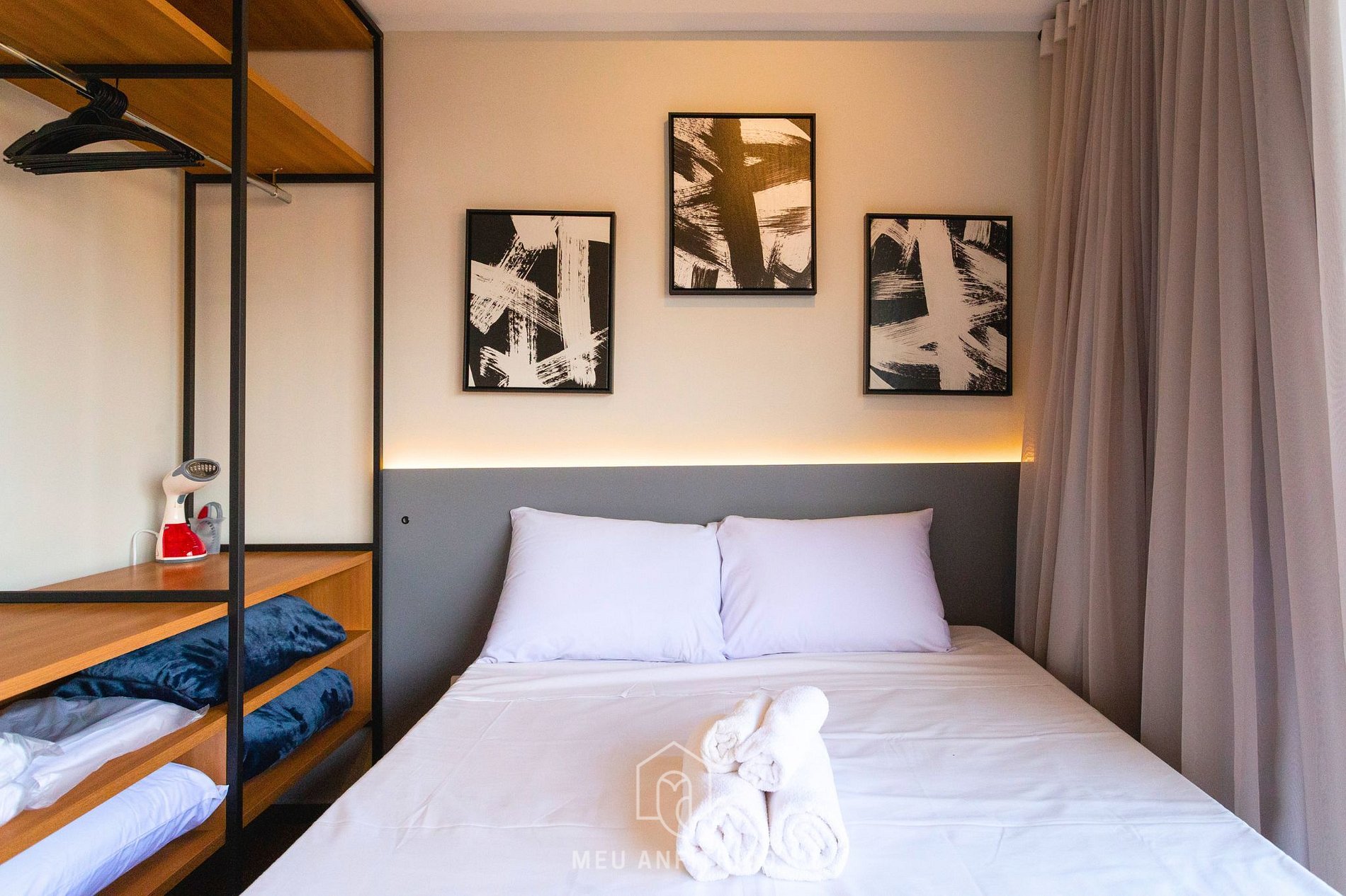 O ambiente também oferece ar-condicionado, vaporizador de roupas, internet Wi-Fi de alta velocidade e guarda-roupa.