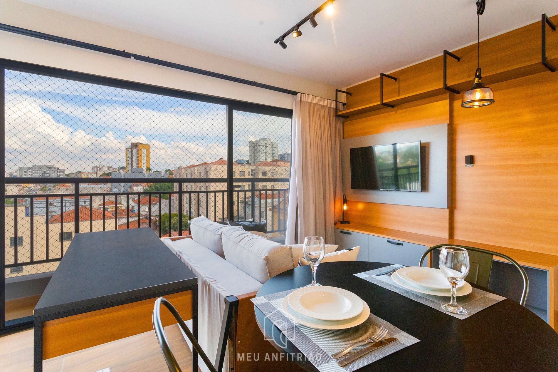 - Varanda com porta de vidro, cortinas blackout e que oferece uma bela vista para a cidade.