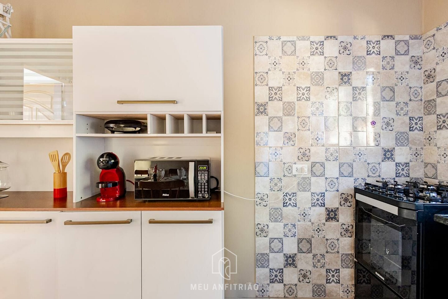 Na cozinha, oferecemos os itens ideais para uma estadia confortável, como fogão, geladeira, forno, sanduicheira, liquidificador, cafeteira Dolce Gusto entre outros.