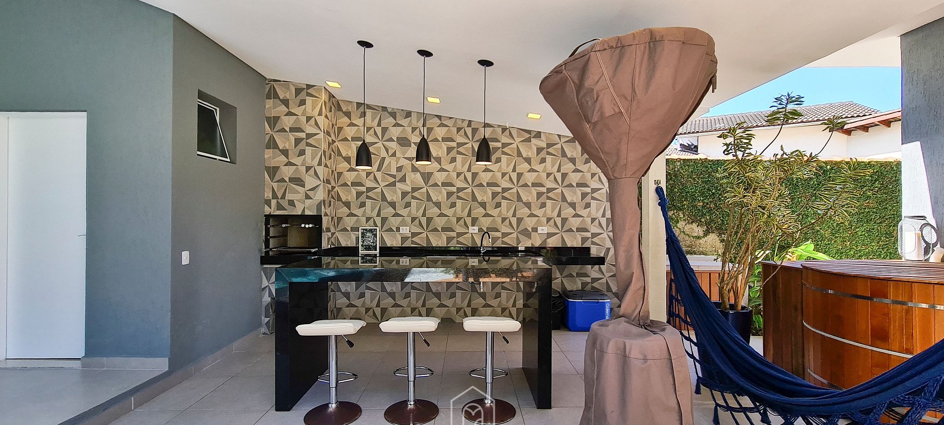 Da sala, é possível acessar a área externa, nela há um espaço integrado por piscina, ofurô e área gourmet com churrasqueira. Para dias mais frios, contamos com um aquecedor.
