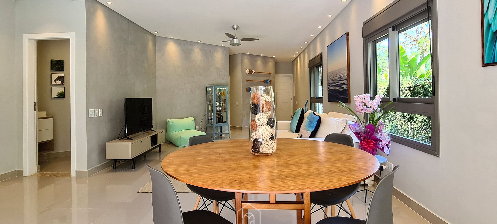 Logo ao entrar na casa, o hóspede terá acesso à uma sala de estar com TV a cabo, sofá retrátil e mesa de jantar. A cozinha é completa com utensílios necessários para a estadia, além de ter uma ilha central com duas banquetas. Nesse espaço contamos, ainda, com um lavabo.