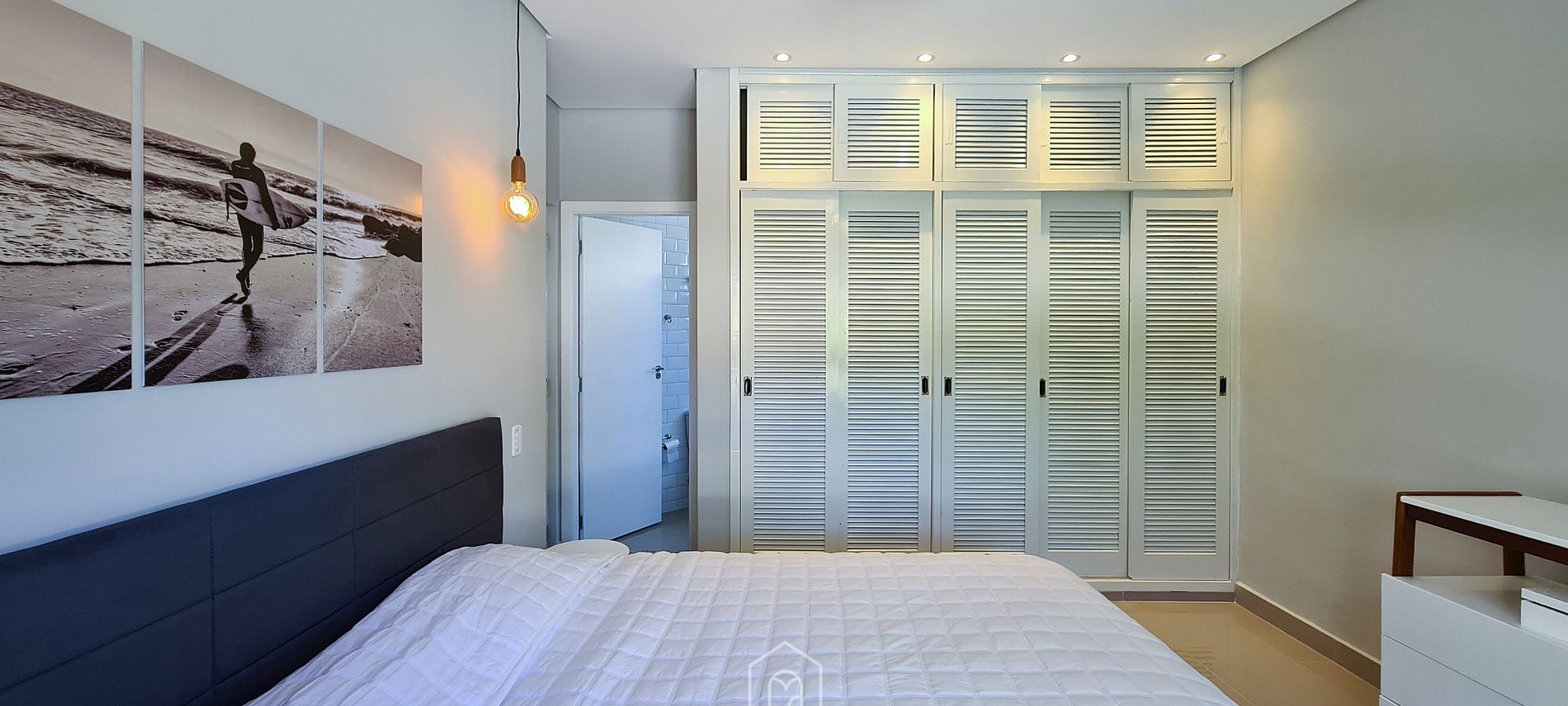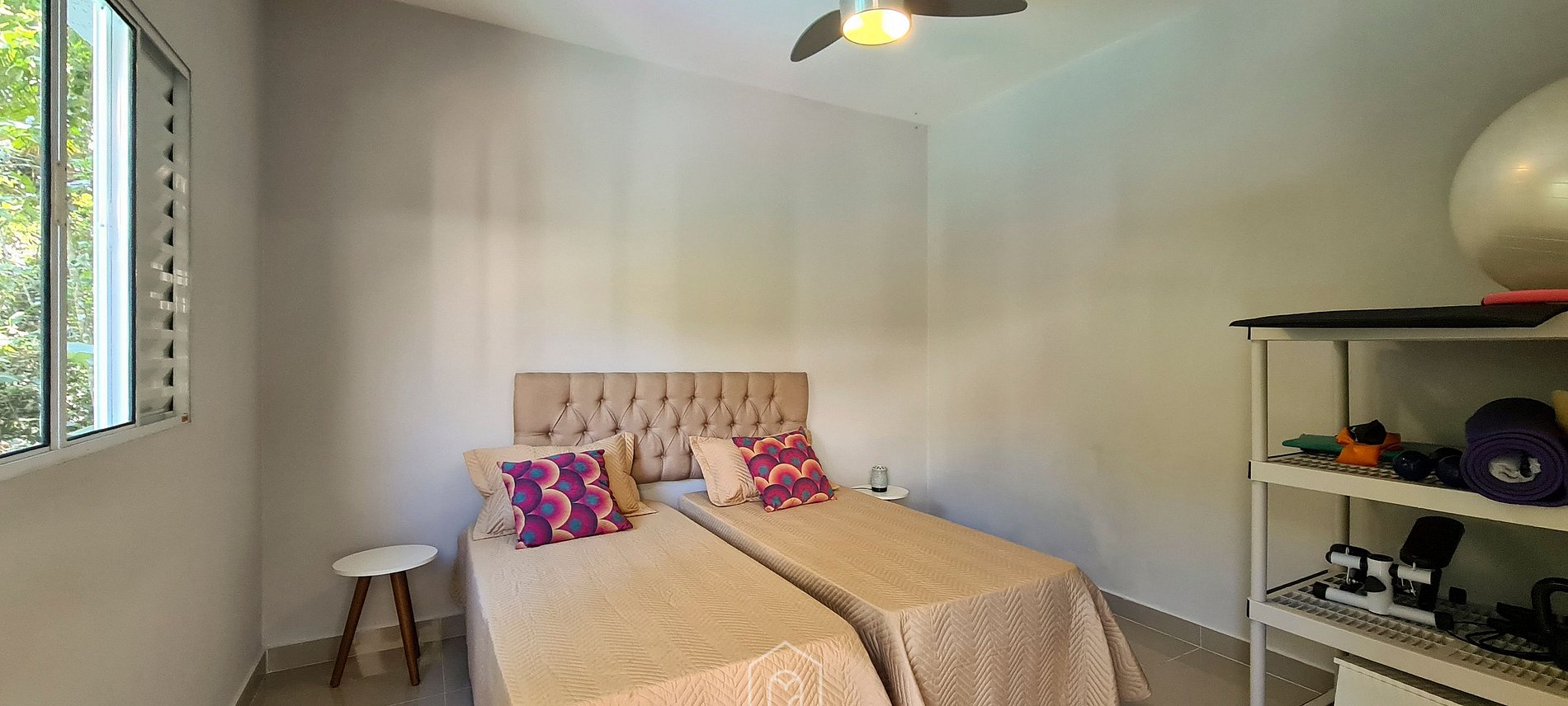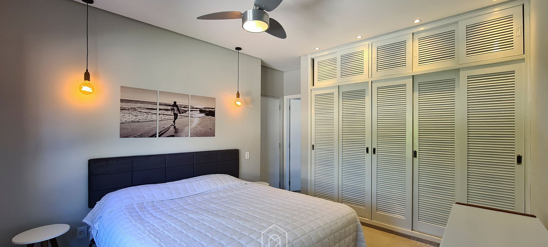 Temos 4 quartos, sendo: 2 suítes, uma com uma cama de casal e a outra com duas camas de solteiro (que podem virar de casal) e 2 quartos de casal que dividem um banheiro. Todos os cômodos possuem ar-condicionado e ventilador de teto.