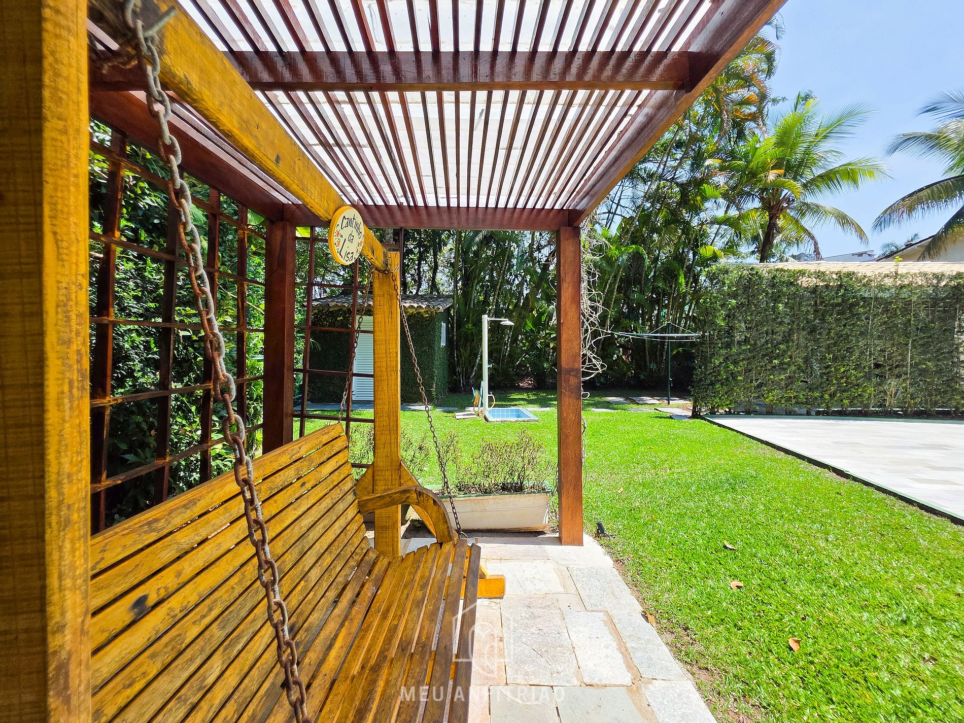 - Área externa com piscina, área gourmet com churrasqueira e um jardim com um pergolado com banco.