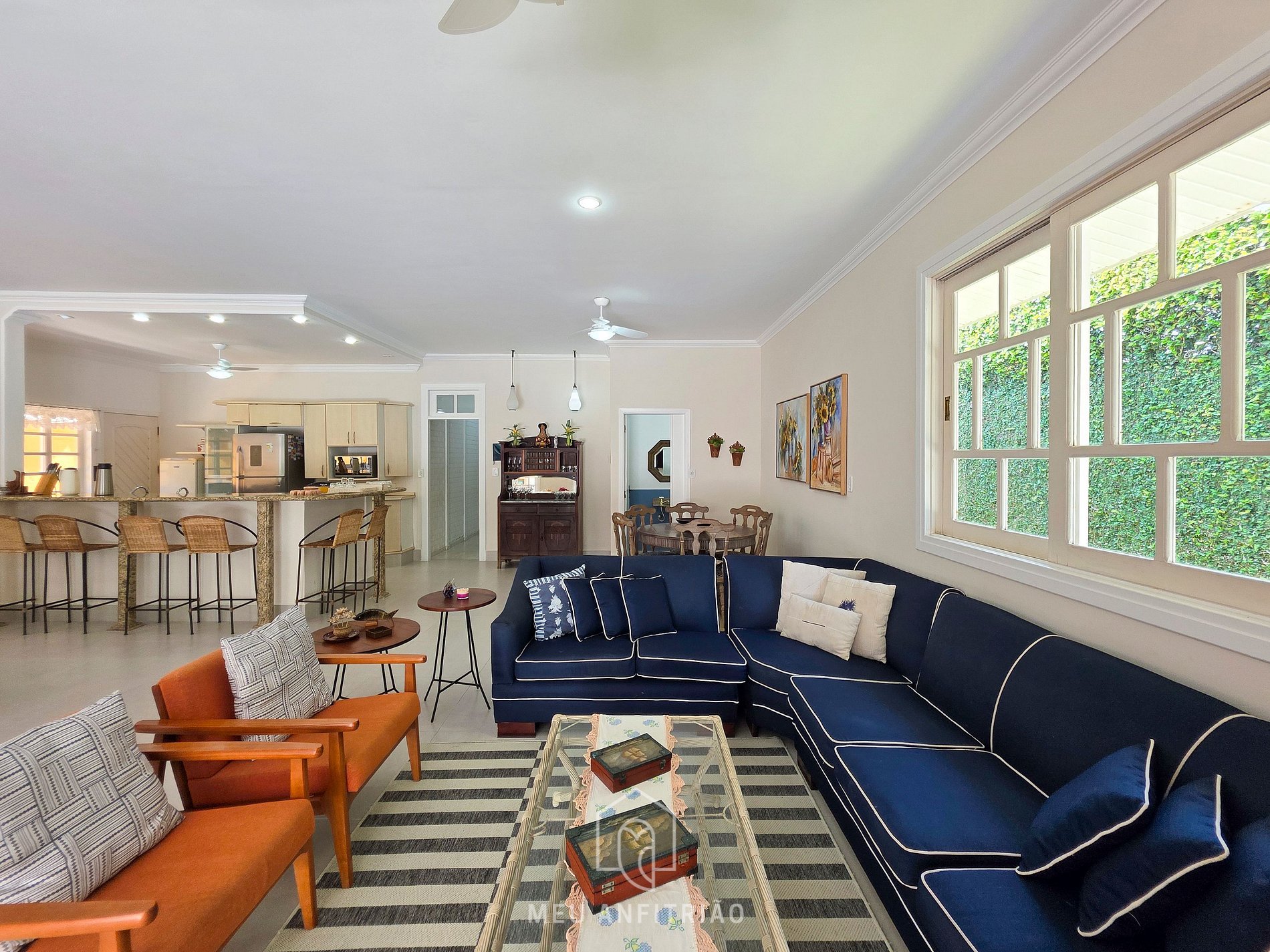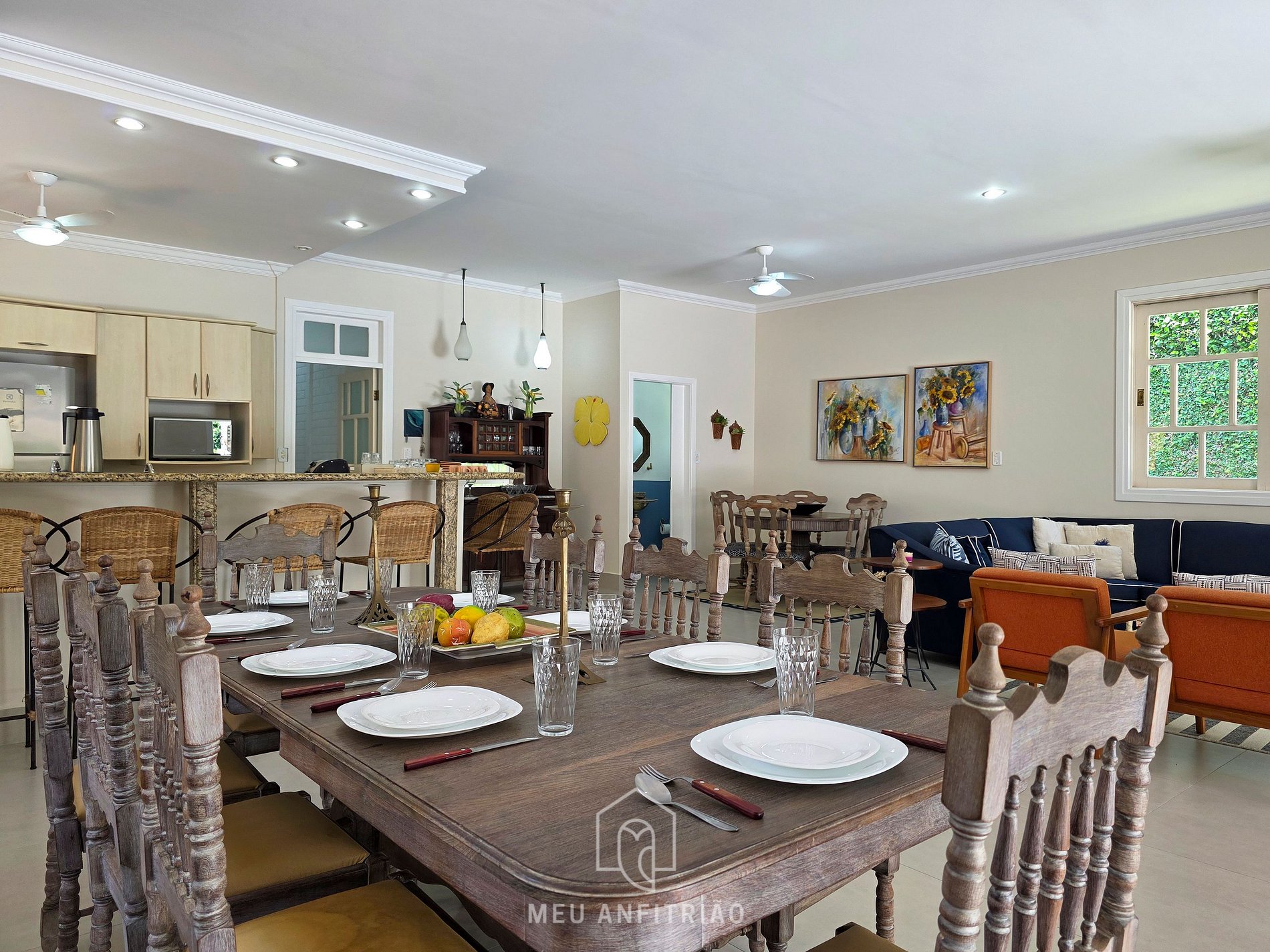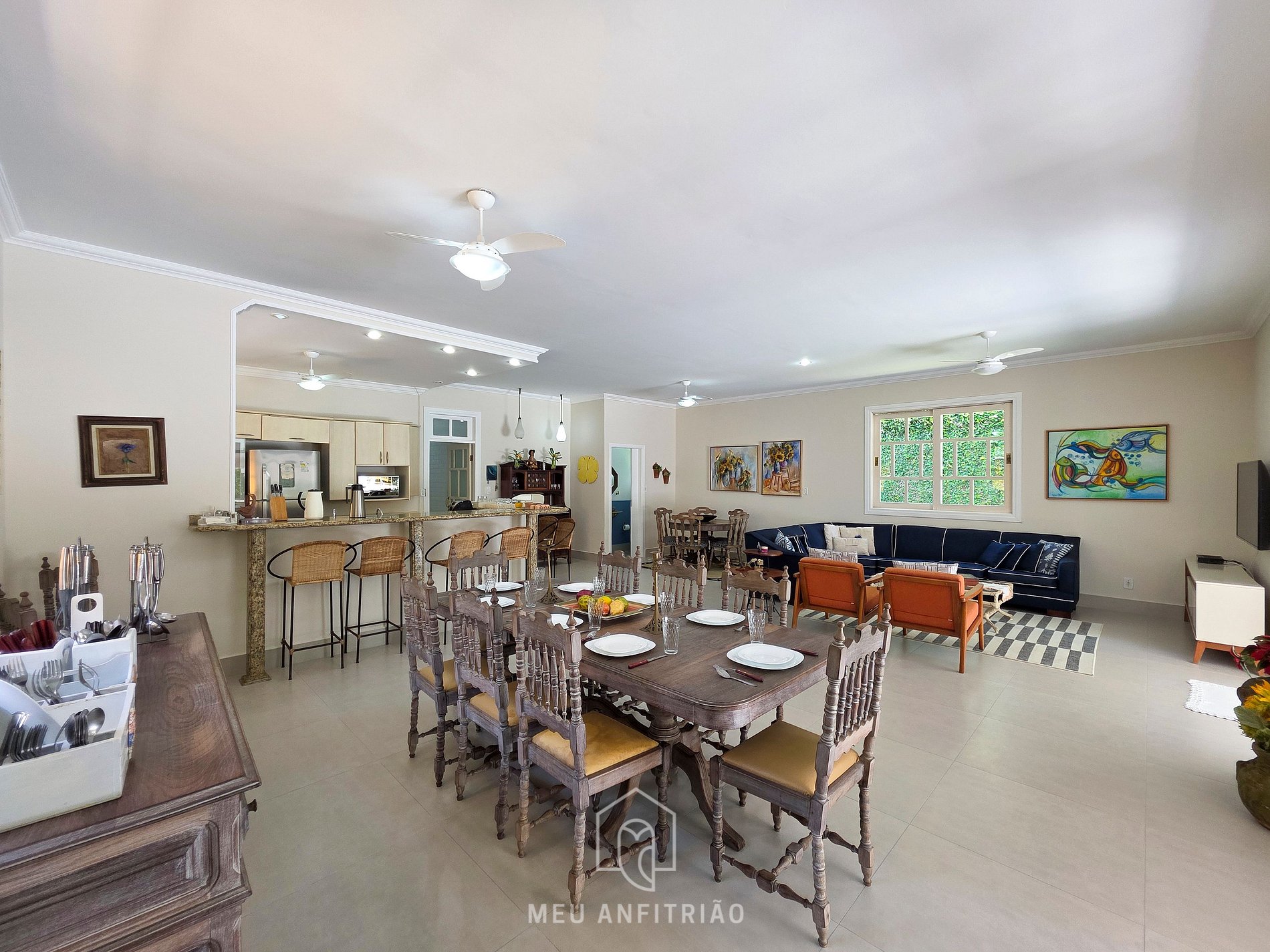 - Uma sala de estar logo na entrada da casa, espaçosa, com sofás, TV Smart, um barzinho e mesa para jogos. No mesmo ambiente, há também uma sala de jantar, que conta com uma mesa com oito lugares.